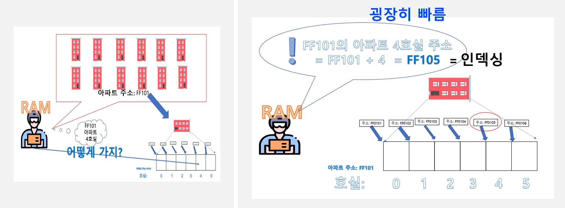 - CPU๋ ์ฐ์ฐ์ ํ์ง๋ง, RAM(๋ฉ๋ชจ๋ฆฌ) ์ ๊ทธ ์ฐ์ฐ์ ํ์ํ ๋ฐ์ดํฐ๋ฅผ ์ด๋ค ๊ตฌ์กฐ๋ก ๋ด์๋์ง๊ฐ ์ค์ํ๋ค.