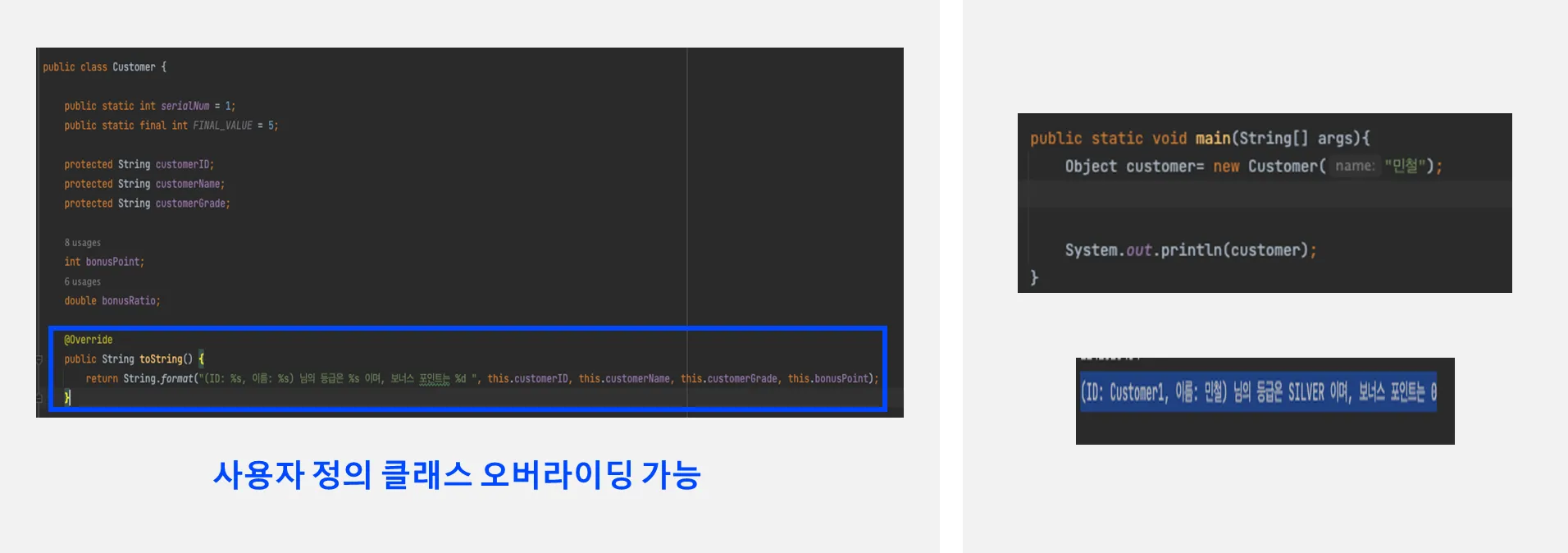 ๊ฐ ๊ฐ์ง ๋ฉ์๋๋ค์ ๋ชจ๋ ํด๋์ค์์ ๋ฐ๋ก ์ฌ์ฉ ๊ฐ๋ฅํ๊ฑฐ๋, ํ์ํ๋ฉด ์ค๋ฒ๋ผ์ด๋ฉํด์ ์ธ ์ ์๋ค.public class Person {