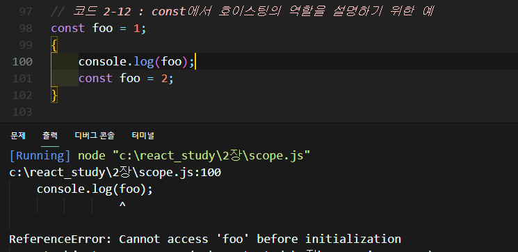 const 또는 let으로 정의된 변수도 호이스팅되지만 변수를 정의하기 전에 그 변수를 사용하려고 하면 참조 에러가 발생한다.