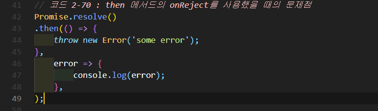 then 메서드의 onResolve함수에서 발생한 예외 같은 then메서드의 onReject함수에서 처리되지 않는다.