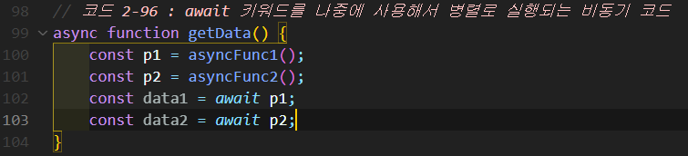 두개의 프로미스를 먼저 생성하고 await 키워드를 나중에 사용하면 병렬로 실행하는 코드가 된다.