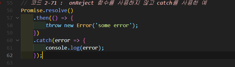 예외처리는 then 메서드의 onReject보다 catch메서드를 이용하는게 가독성 면에서 더 좋다.