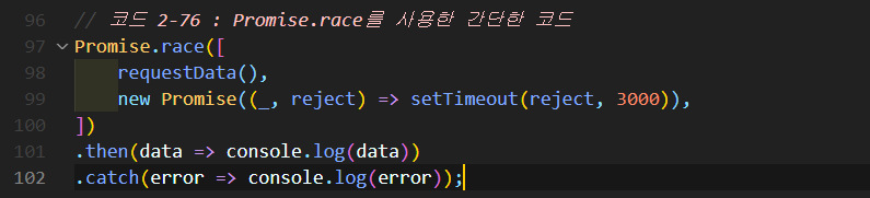 requestData 함수가 3초안에 데이터를 받으면 then메서드가 호출되고 그렇지 않으면 catch메서드가 호출된다.