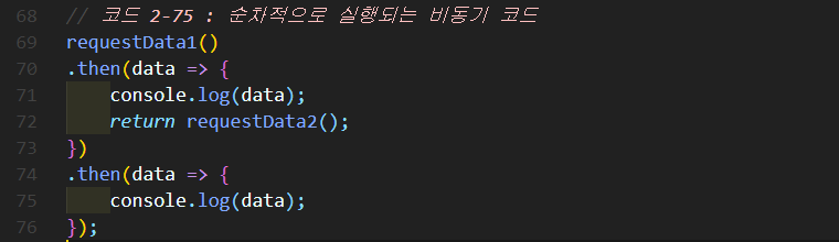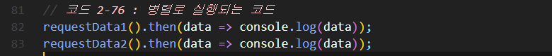 requestData 함수가 반환하는 프로미스가 처리됨 상태가 될때까지 console.log(data1, data2)는 출력되지 않는다.