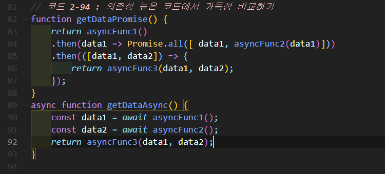 비동기 함수간의 의존성이 높아질 수록 async await와 프로미스의 가독성 차이가 더 선명하게 드러난다.