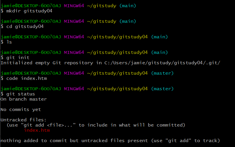 git bash에 status 명령어를 입력하면 Untracked files에 새로운 파일이름이 빨간색으로 뜬다.