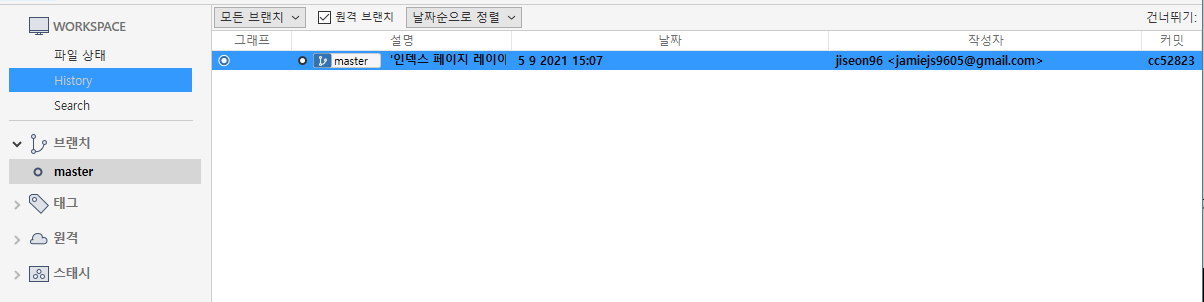 소스트리의 master브랜치를 선택하면 커밋의 로그 기록이 순차적으로 나열되는 것을 확인할 수 있다.