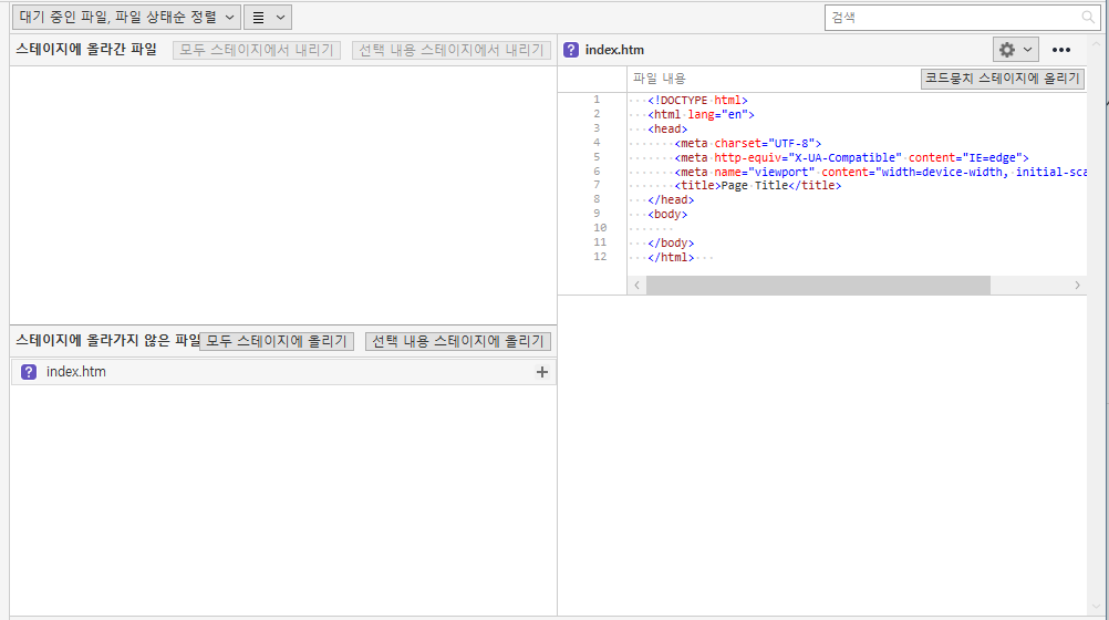 전체 파일을 스테이지 영역에 등록할 때는 모두 스테이지에 올리기를 누른다.