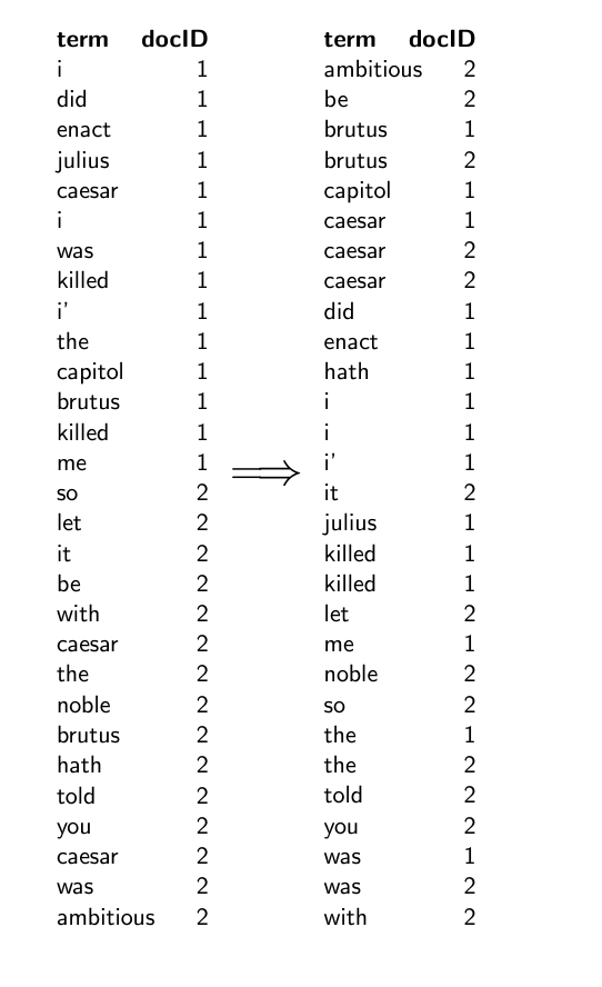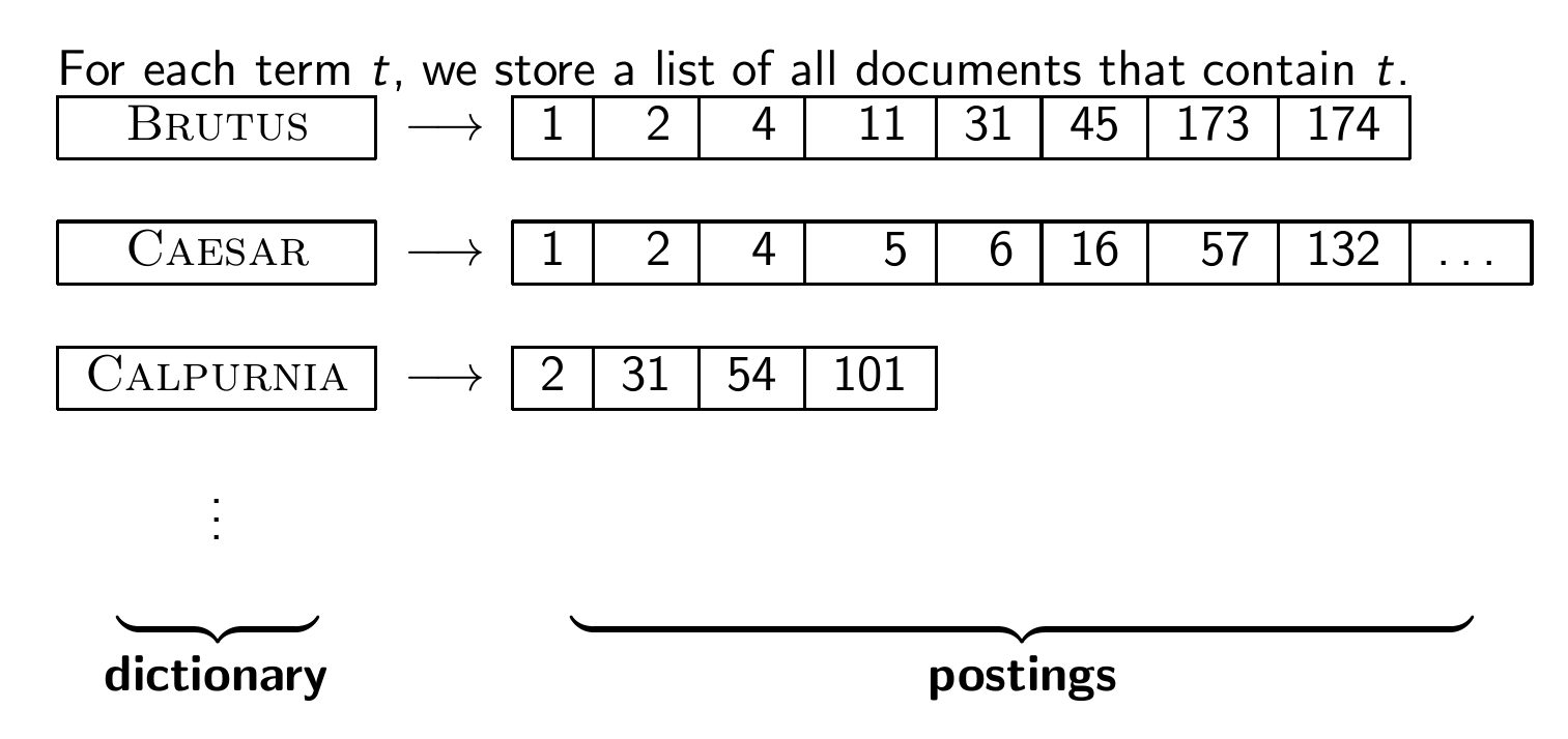 사진 자료처럼 각 용어에 대해서 그 용어를 포함하고 있는 문서들의 리스트를 저장한다.