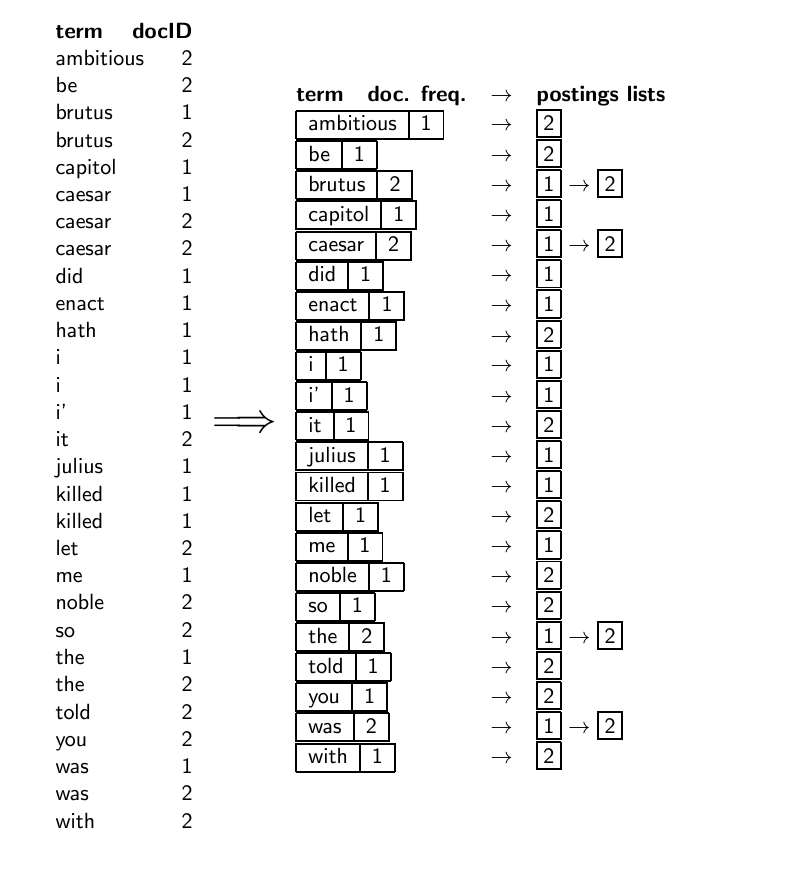 postings list를 만들고 document frequency를 결정한다. (사진상에서는 ambitious는 1번 나왔으니까 1, brutus는 2번 나왔으니까 2다.)