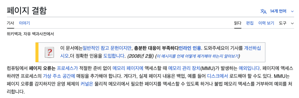 위키백과를 보면 페이지 폴트는 메모리에 어쩌구 저쩌구라고 써져있다.