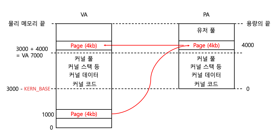 따라서 KERN_BASE + PA를 계산하면 커널용 연결 주소(KVA-7000)를 얻을 수 있다.