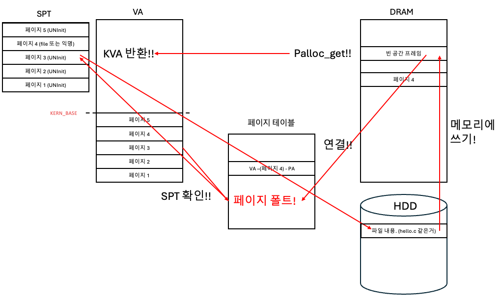 진짜로 접근한다면 SPT를 보고 HDD에서 hello.c 파일을 읽어서 물리 메모리에 써주면 된다!