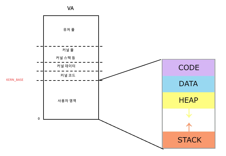 그럼 가상 주소도 작은거 아닌가? 생각이 들 수 있지만. KERN_BASE 아래의 공간이 있기 때문에