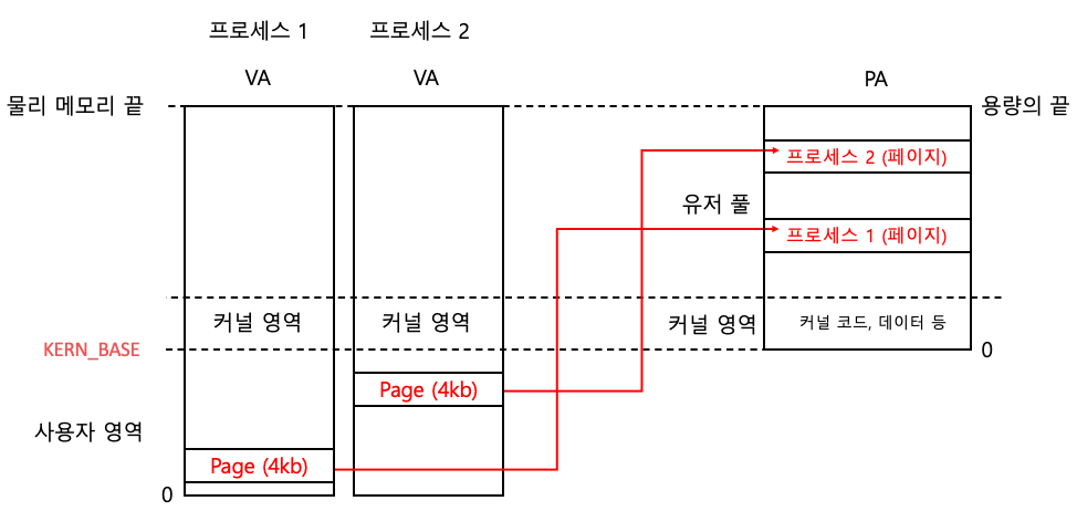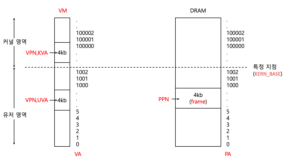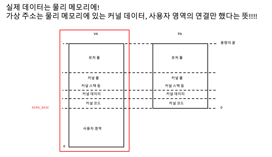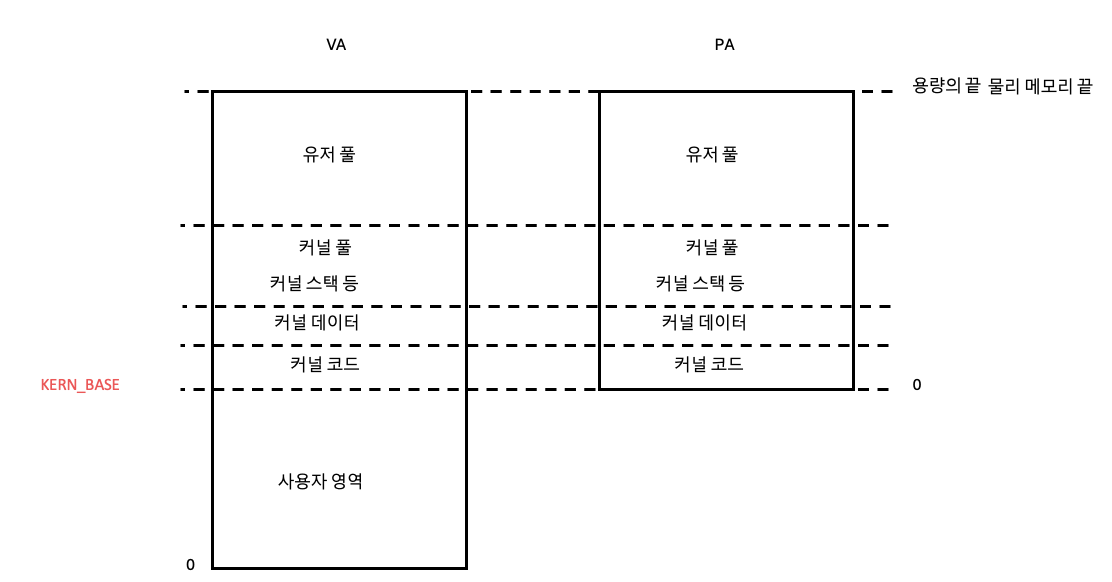 요건 프로세스를 만들고 가상 메모리를 만들 때. KERN_BASE 위로 물리 메모리의 PA랑 맵핑을 다 해놓는다.