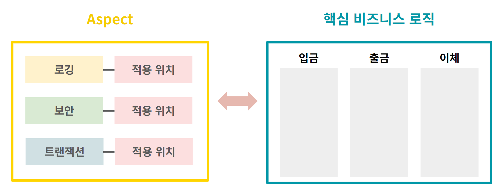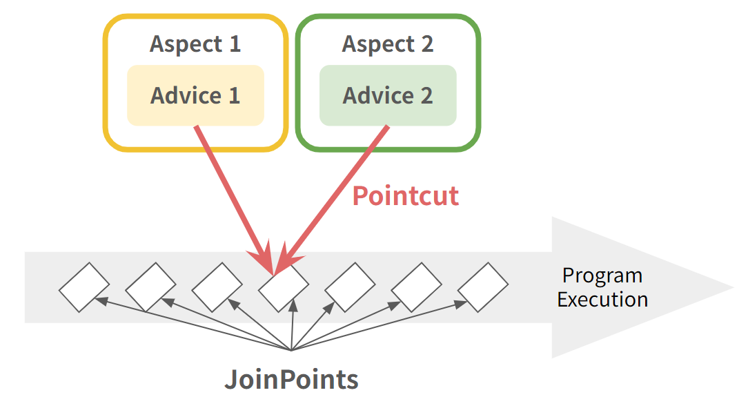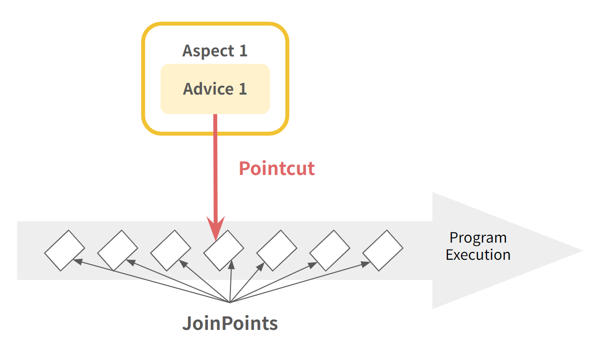 따라서 AOP는 부가기능을 Aspect라는 특별한 객체로 모듈화하여 핵심 기능에서 분리하는 것을 목표로 한다. Aspect 객체에는 부가기능(Advice)과, 그 부가기능이 적용될 위치(PointCut)이 정의되어 있다.
