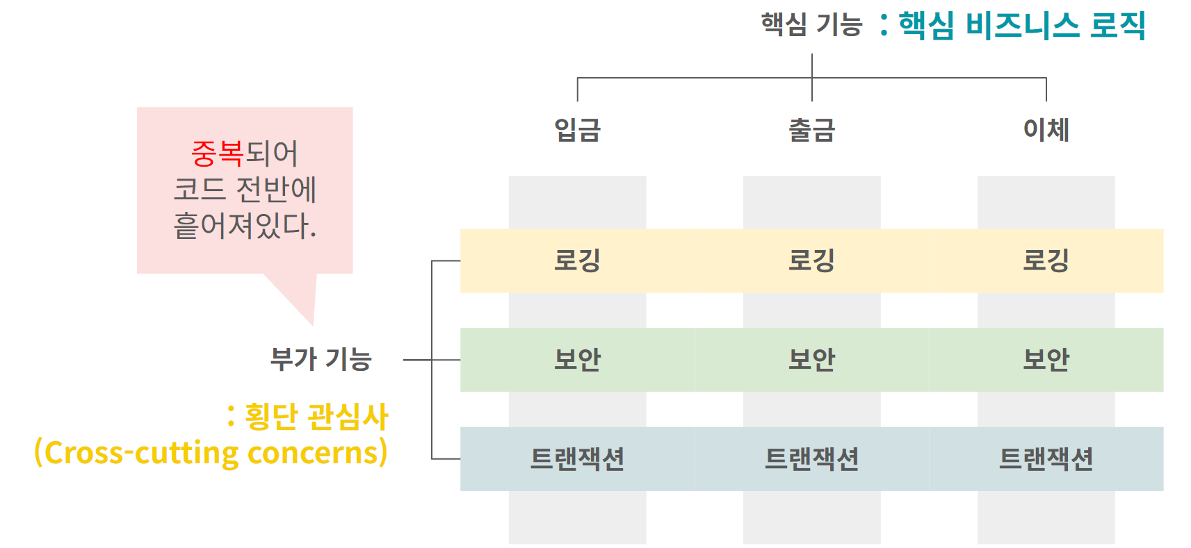 애플리케이션은 핵심기능과 부가기능으로 이루어져 있다. 이때, 부가기능은 여러 핵심기능에서 중복적으로 동작한다. 부가기능이 전체 코드에 중복되어 흩어져있기 때문에, 코드를 유지보수 하기 힘들고, 저장공간이 낭비된다.