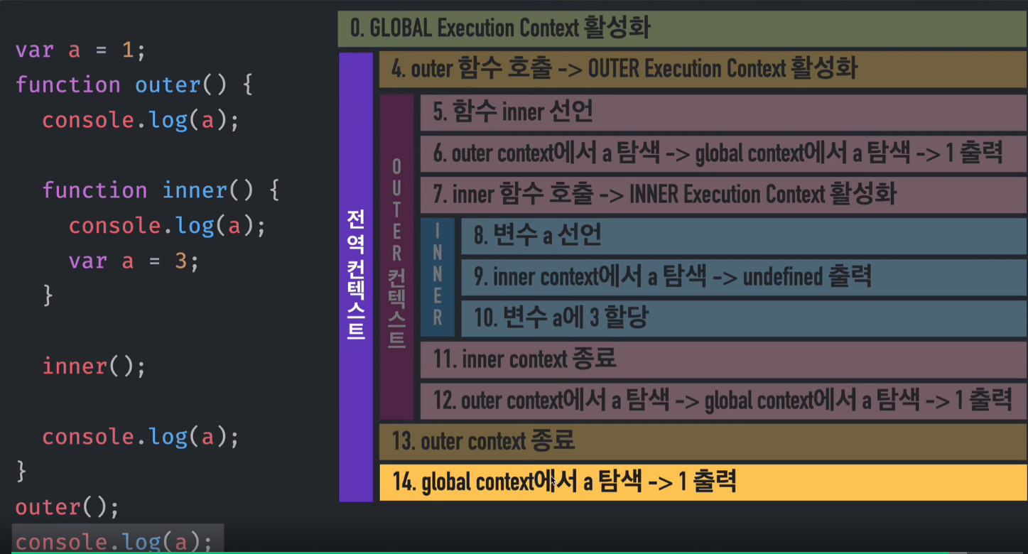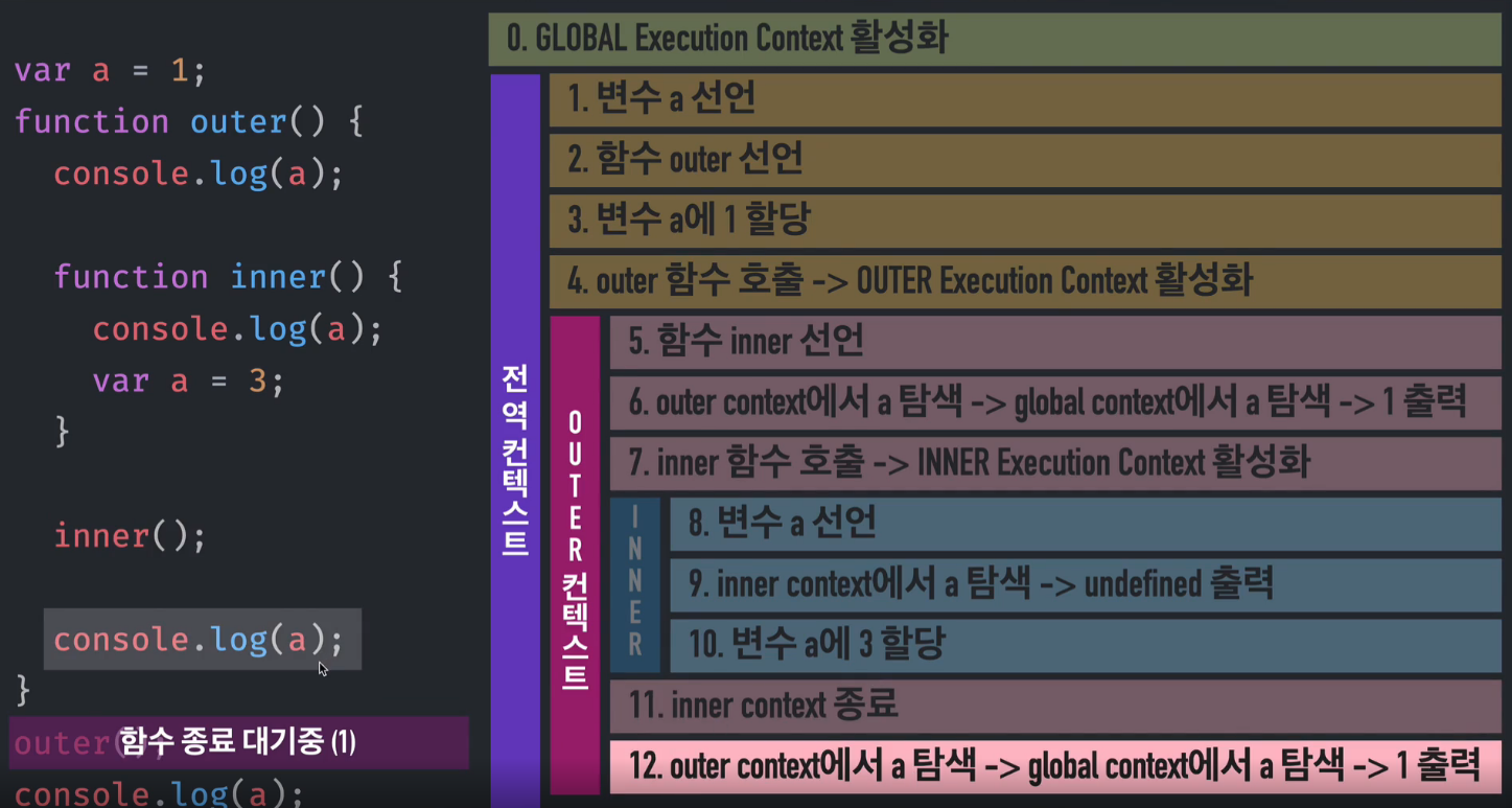 outer 함수에 a의 값이 없으므로 전역 컨텍스트의 a를 참조하여 값을 출력한다.