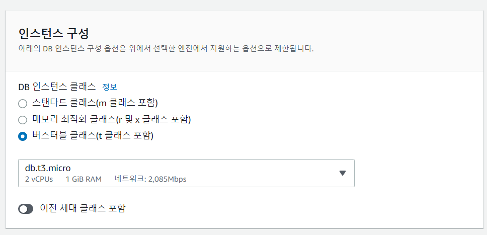 DB 인스턴스 클래스를 버스터블 클래스 중 db.t3.micro로 사용 중이었던 것이다. db.t2.micro를 사용해야 과금이 되지 않는다.