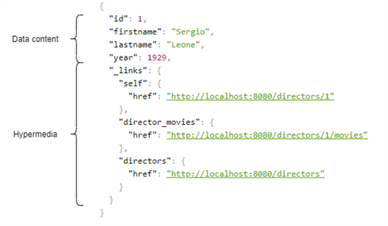 우선 헤이티오스가 적용되지 않은 응답 부분(Data Content)만 보면 '세르조 레오네'라는 영화 감독의 이름과 출생년도를 id와 함께 전달하고 있다. 여기에 헤이티오스가 적용된 부분을 보면 _links 부분에 객체가 전달되고 있는데, self, director_movies, directors까지 총 3개의 값에 대한 하이퍼링크도 전달되고 있다.