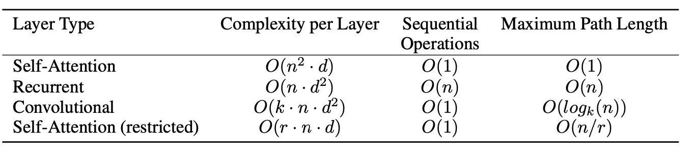 - RNN은 O(n) 시간을 소요하는데, 계산복잡도 면에서 self attention layer가 n < d이면 RNN보다 훨씬 빠르게 됨(대부분의 machine translation task는 n < d)