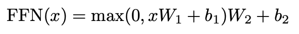 - ReLu 활성화 함수를 포함한 두 개의 선형 변환이 포함됨