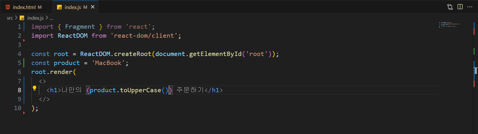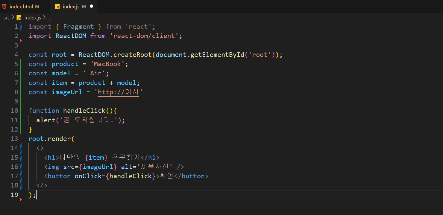 자바스크립트와 html을 섞어서 쓸 수 있는 자바스크립트의 확장된 문법
