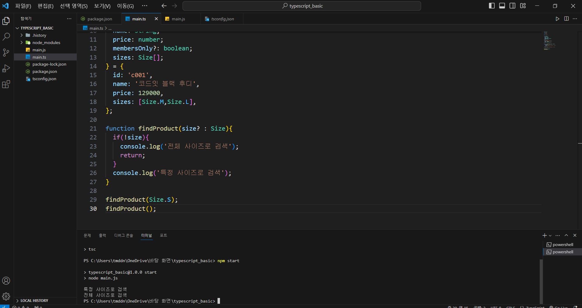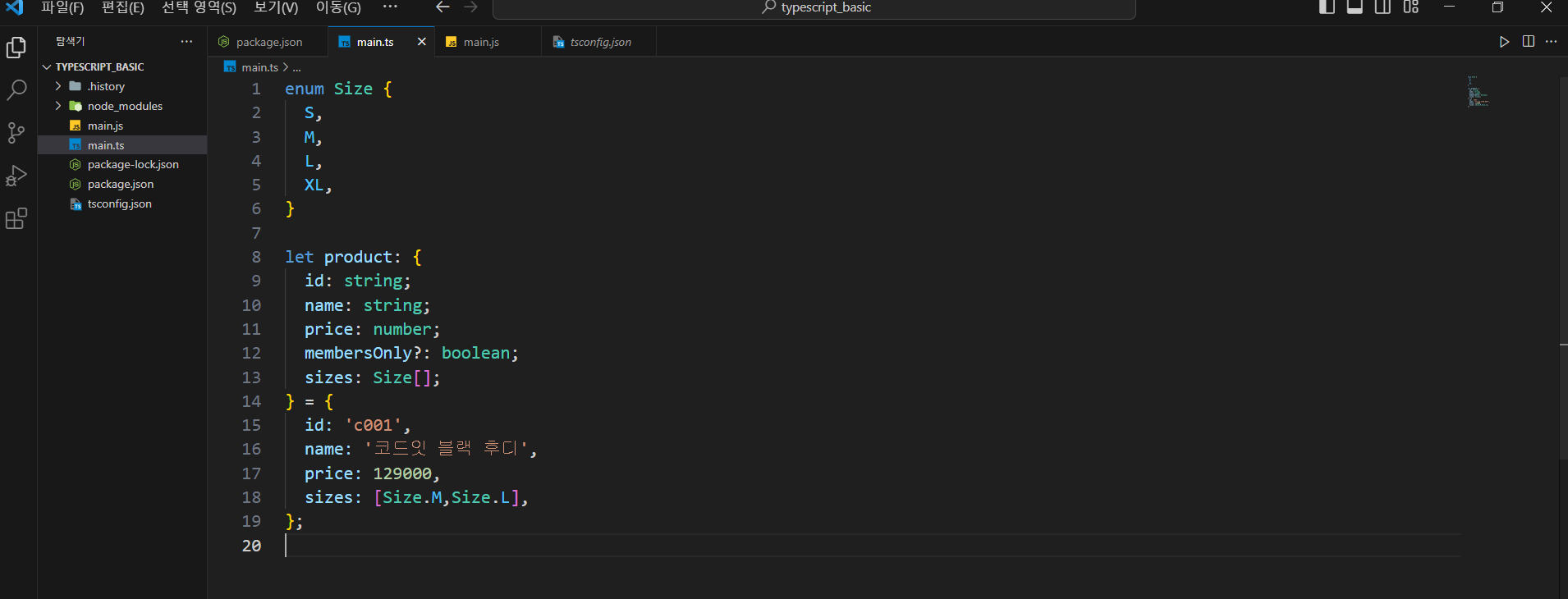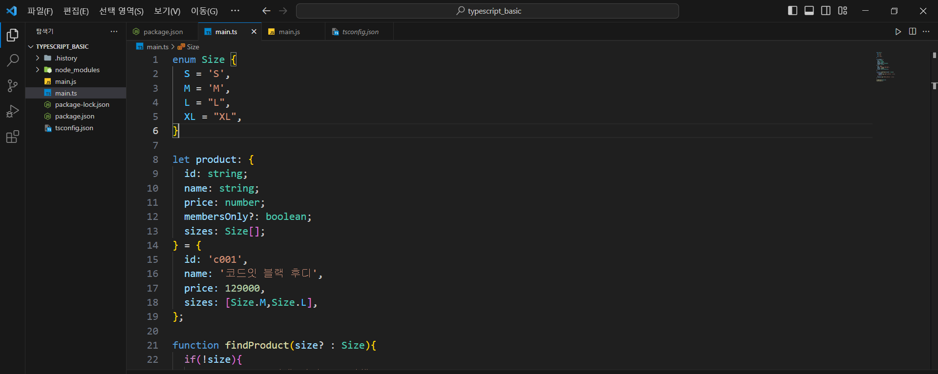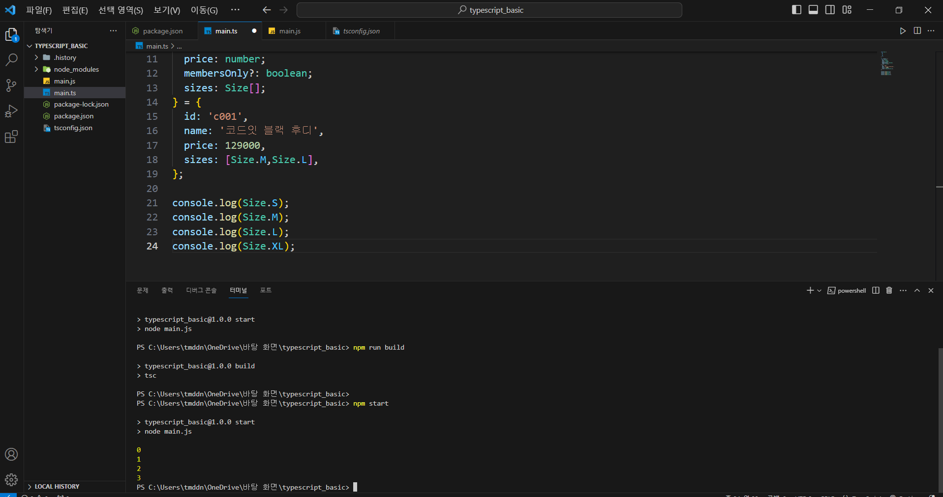이때 기본값은 0부터 시작하는 정수enum Size { S, M, L, XL, } console.log(Size.S); // 0 console.log(Size.M); // 1 console.log(Size.L); // 2
