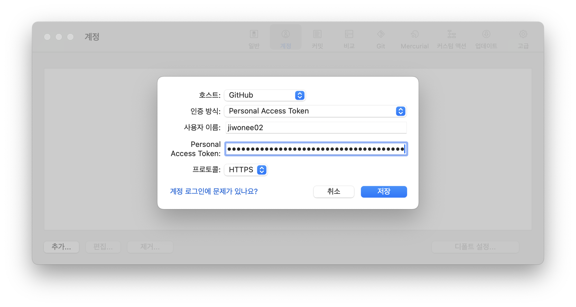 Sourcetree ํด๋ฆญ ํ ์ค์ ํด๋ฆญ์ถ๊ฐ ๋ฒํผ ๋๋ฌ ๊ณ์ ์์ฑPersonal Access Token์ ๋ฐ๊ธ๋ฐ์ ํ ํฐ ๋ถ์ฌ๋ฃ๊ธฐ