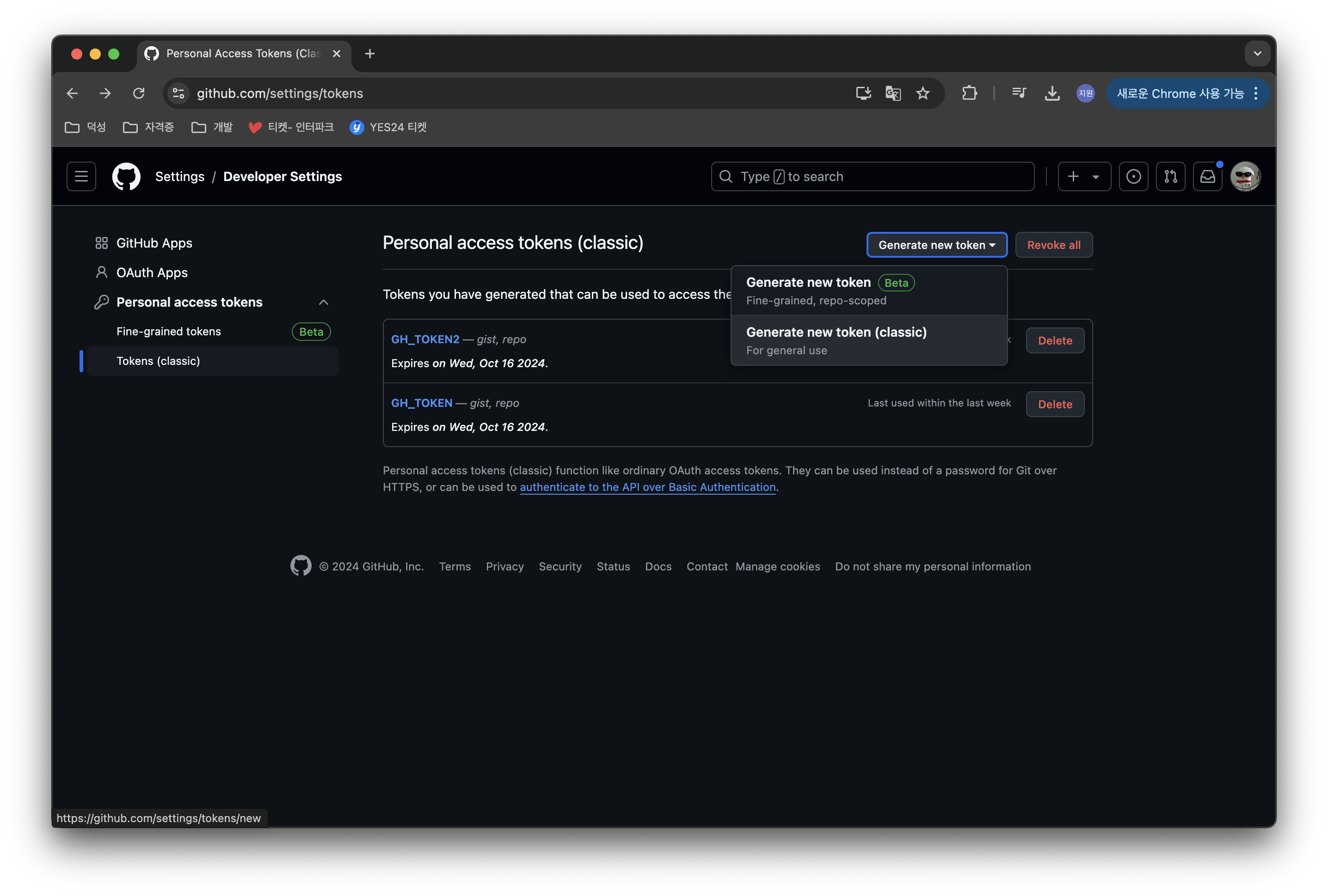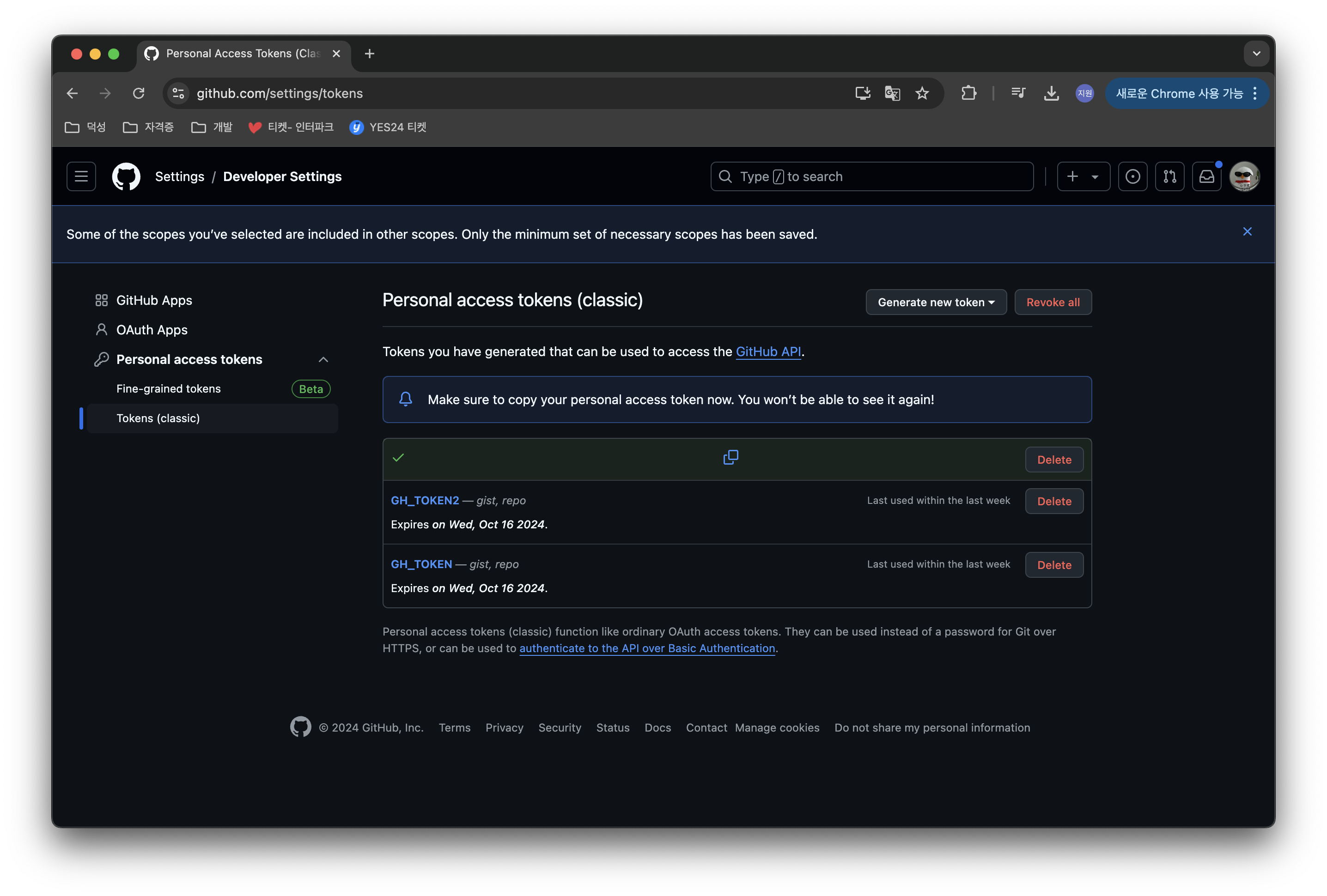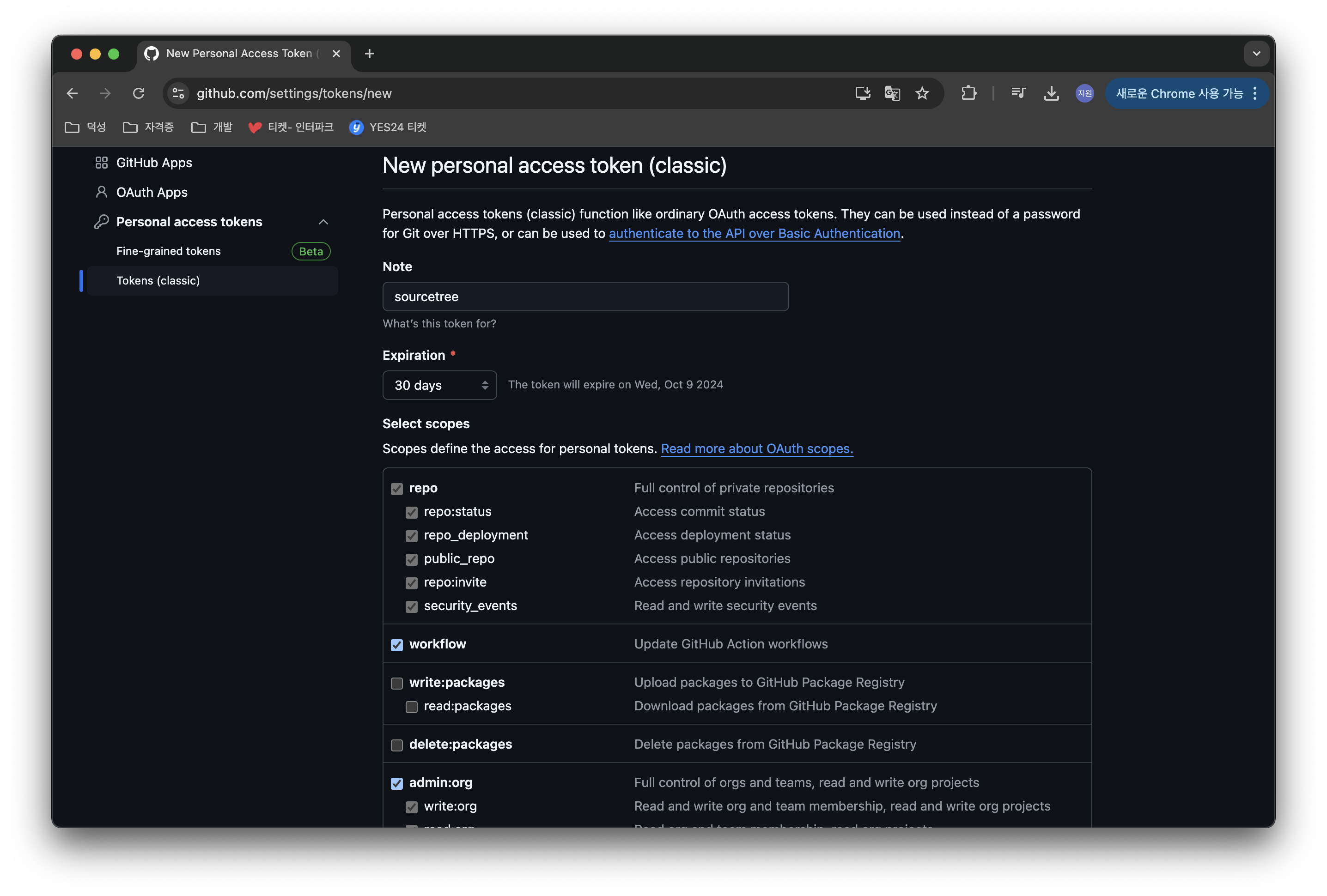 repo, workflow, admin:org, admin:public_key, gist, user, delete_repo๋ฅผ ์ฒดํฌ ํ ์์ฑ
