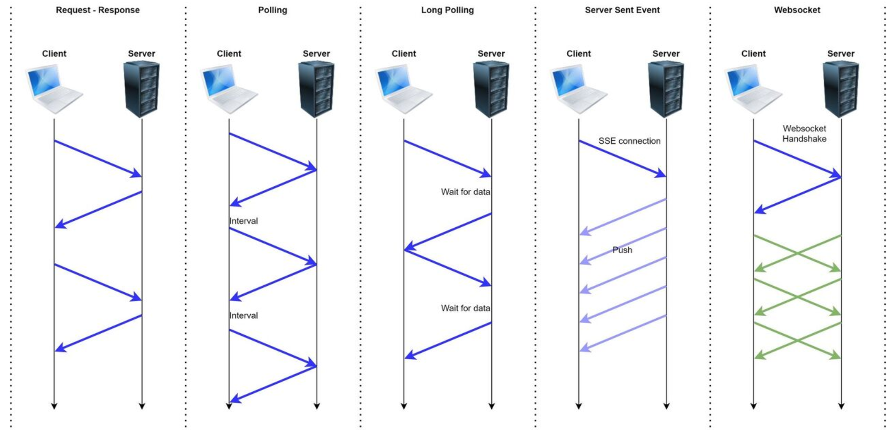 이를 위해 주로 사용되는 두 가지 프로토콜은 HTTP (HyperText Transfer Protocol) 와 WebSocket가 있다.
