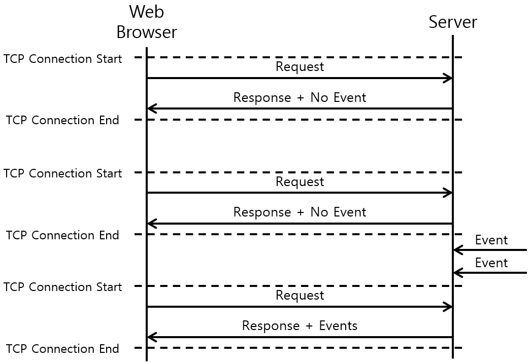 Long Poling은 서버에서 응답이 오면 새로 연결하여 서버에 요청을 보냅니다.