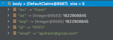 위와 같은 정보를 넣어준 후에 getBody()를 호출하게 되면, Claim 타입의 결과 객체를 반환하게 되는데, 여기에서 저장된 클레임 정보들을 확인할 수 있습니다.