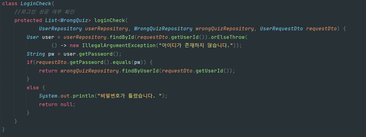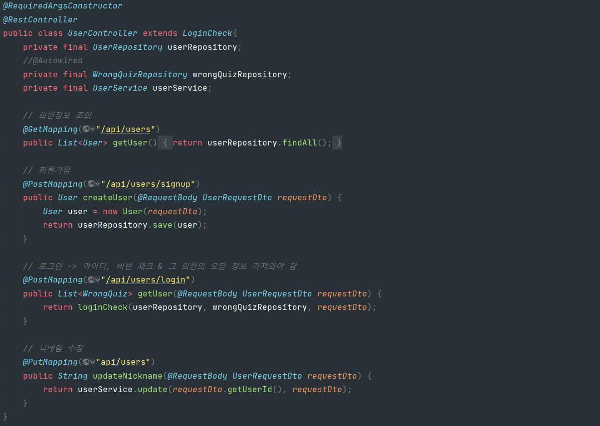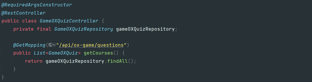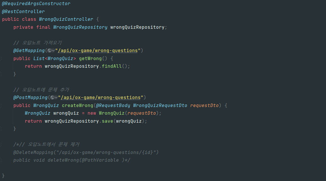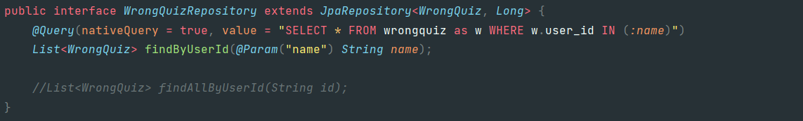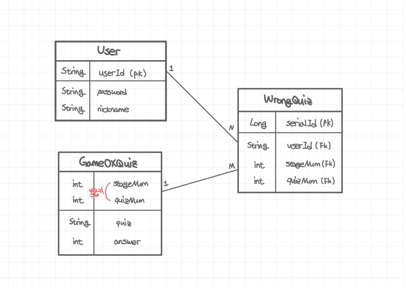 WrongQuiz 테이블의 userId가 String 타입으로 선언이 안 되어있고, User 테이블의 기본키를 참조하는 형식으로 되어 있어서 그런가 자꾸 에러가 났음Querydsl 방법도 찾아보고 하루종일 구글링만 한듯@EmbeddedId로 설정한 복합키는 Querydsl가 어렵다는 글을 보고 @IdClass로 갈아탄 것도 있음..Querydsl이 내 생각처럼 안 돼서,, 결국 SQL 쿼리 사용🔎 GameOXQuizController.java