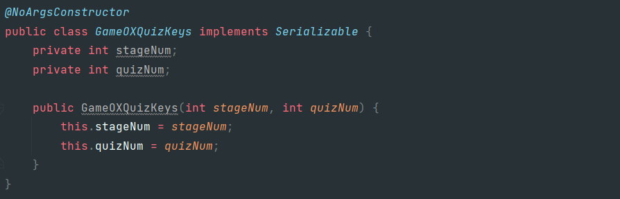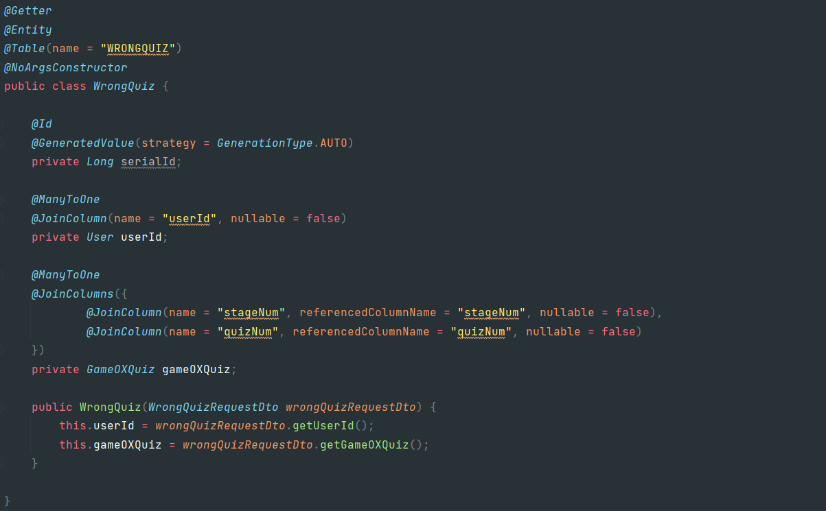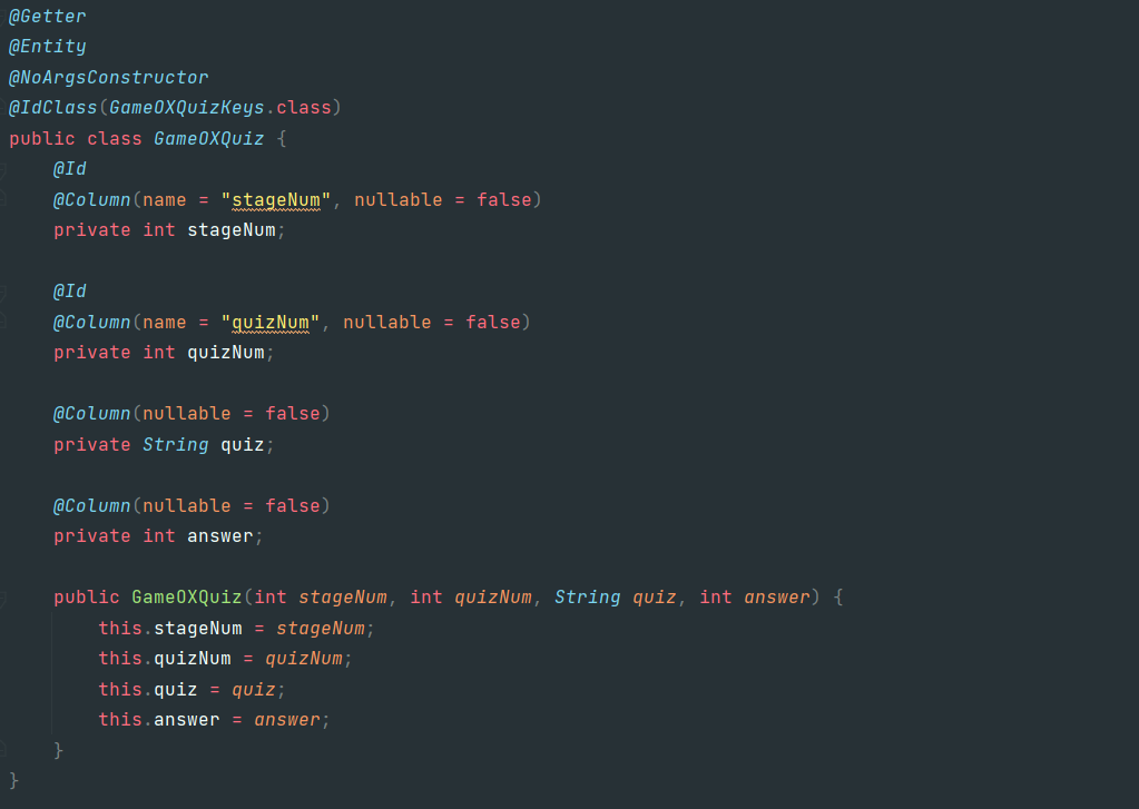 @IdClass 사용@EmbeddedId를 사용했었는데, 특정 column 참조가 어려워서 @IdClass로 변경stageNum + quizNum🔎 GameOXQuiz.java