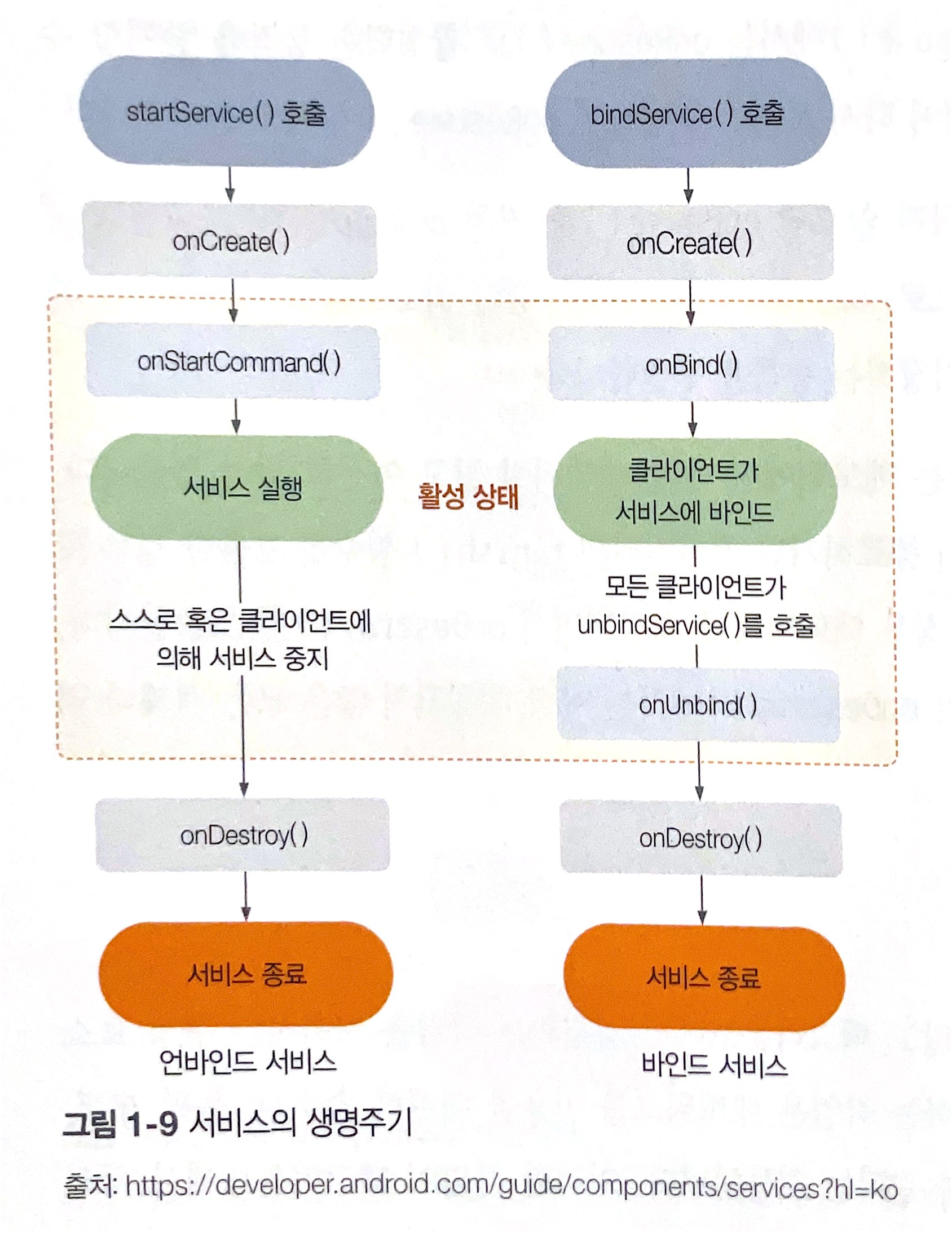 - 서비스의 시작과 종료 시에 각각 onCreate(), onDestroy()가 호출되는 것은 일반 서비스와 동일