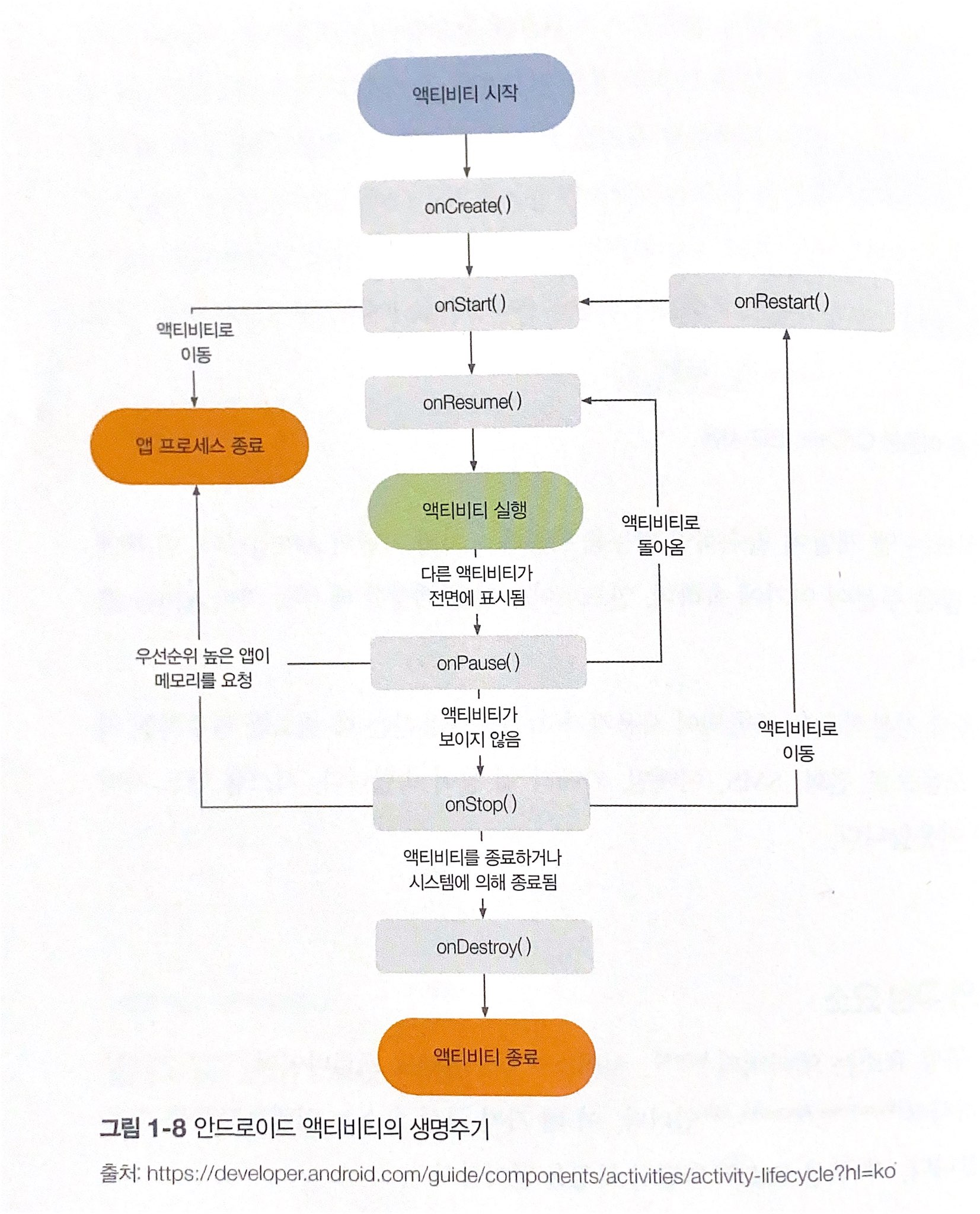 - 모든 안드로이드 앱은 적어도 하나의 액티비티를 가지고 있으며, 앱을 실행하면 지정된 액티비티의 코드가 생명주기에 맞추어 호출