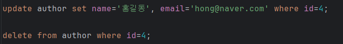 | (실습) author 테이블의 id가 4인 데이터의 name과 email을 변경하는 쿼리문 |