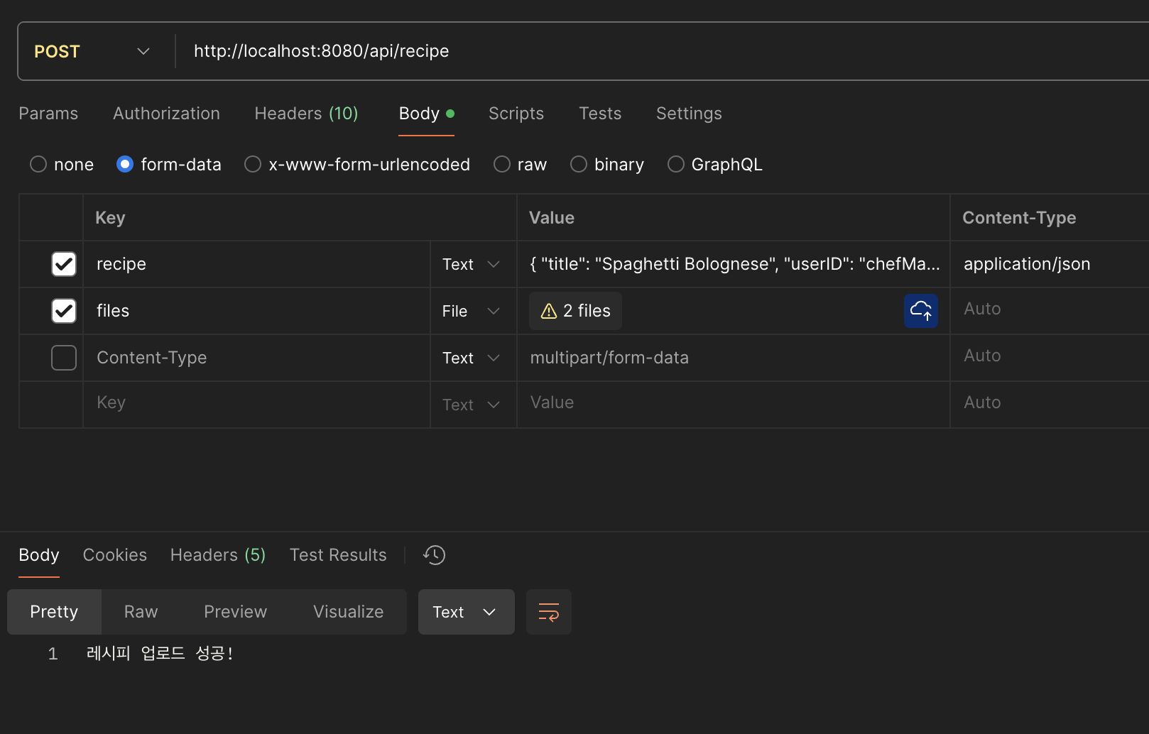 recipe라는 request 객체 내부에서 [{설명1 ,사진1},{설명2 ,사진2}] 으로 이미지파일도 객체내부에 포함하여 전달받으려고 했는데, 실패했다