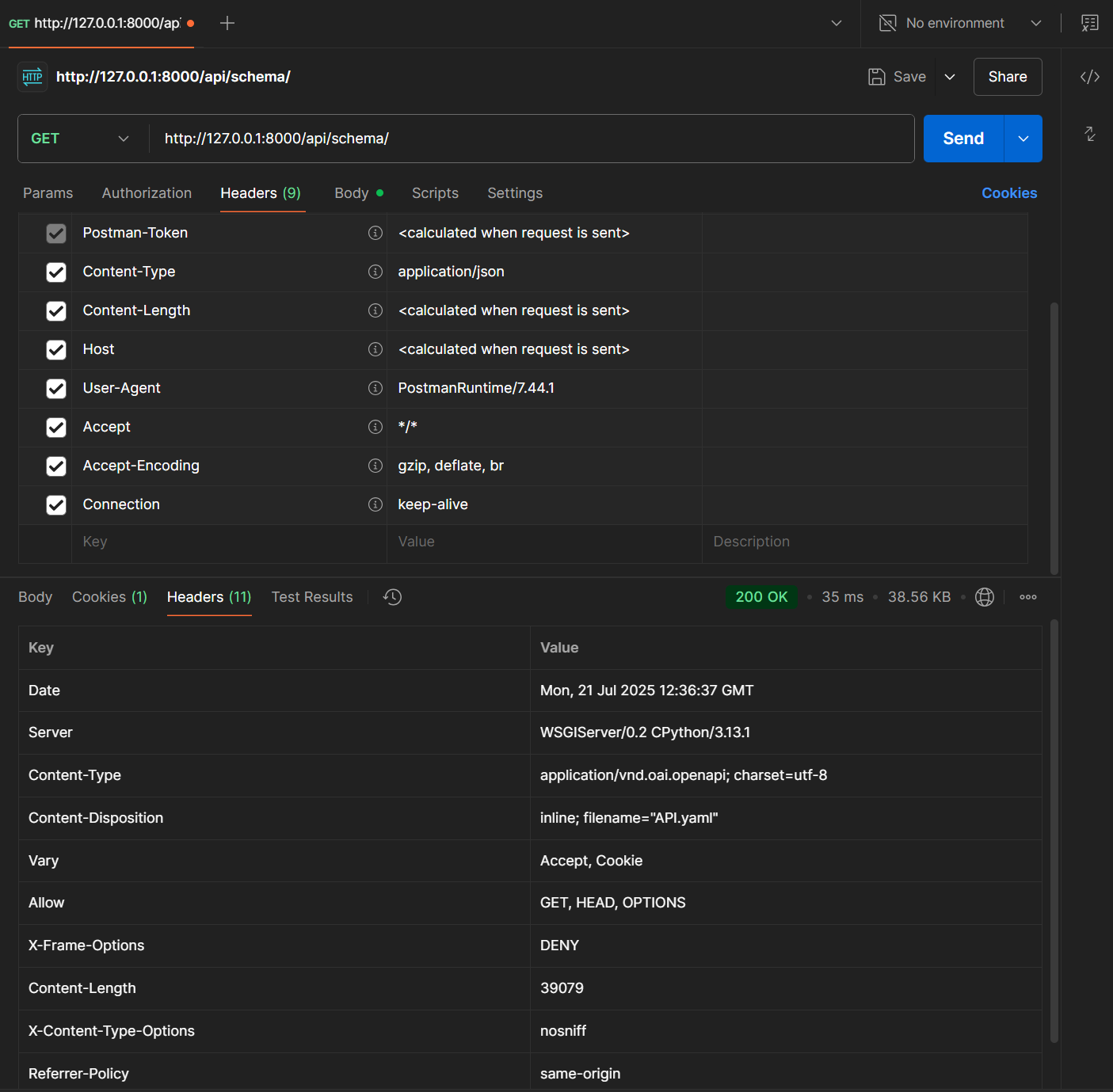 서버를 돌리고 SpectacularAPIView에 연결된 URL로 요청이 들어오면 스키마 제너레이터가 프로젝트의 뷰와 시리얼라이저를 분석해 자동으로 스키마를 생성한다.