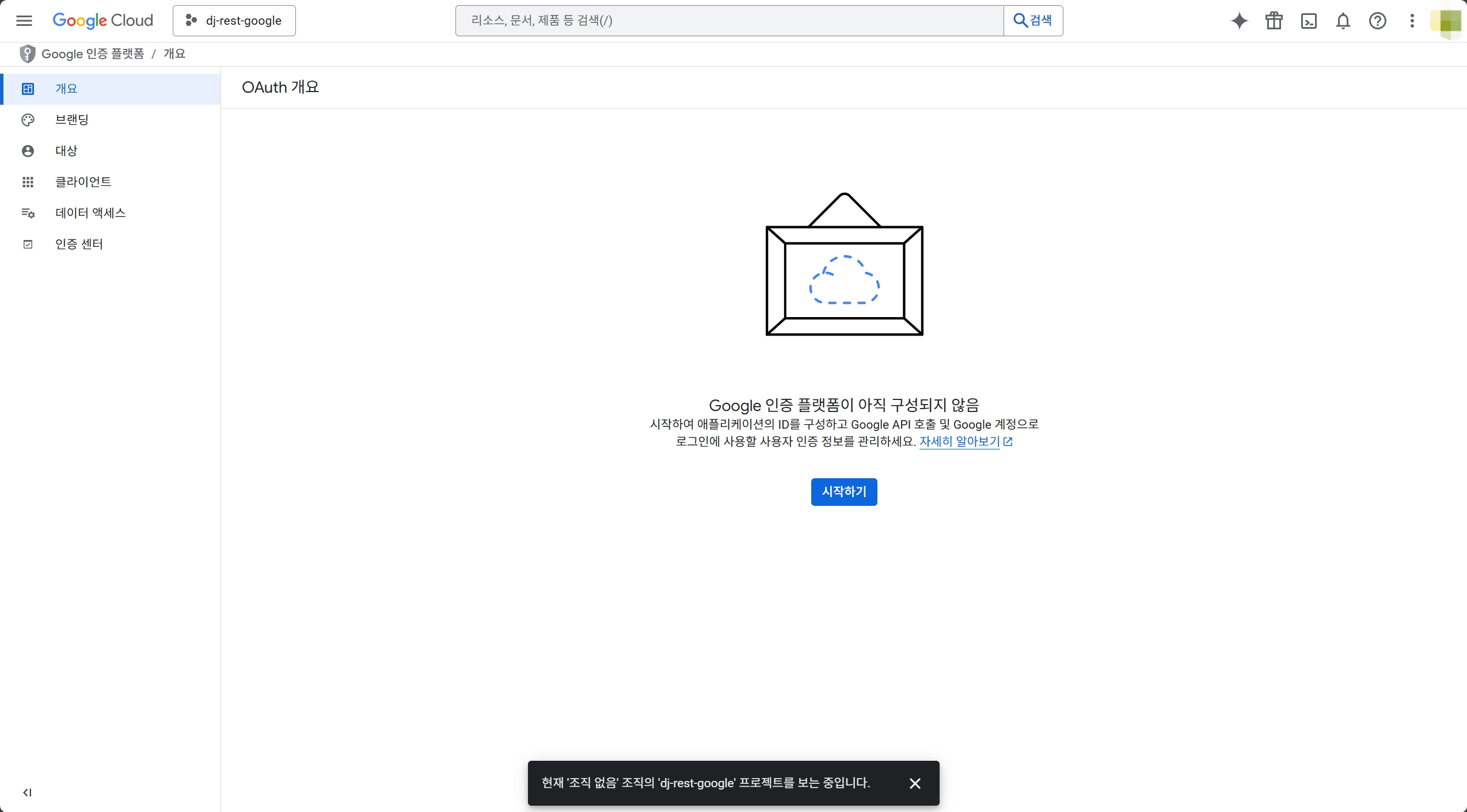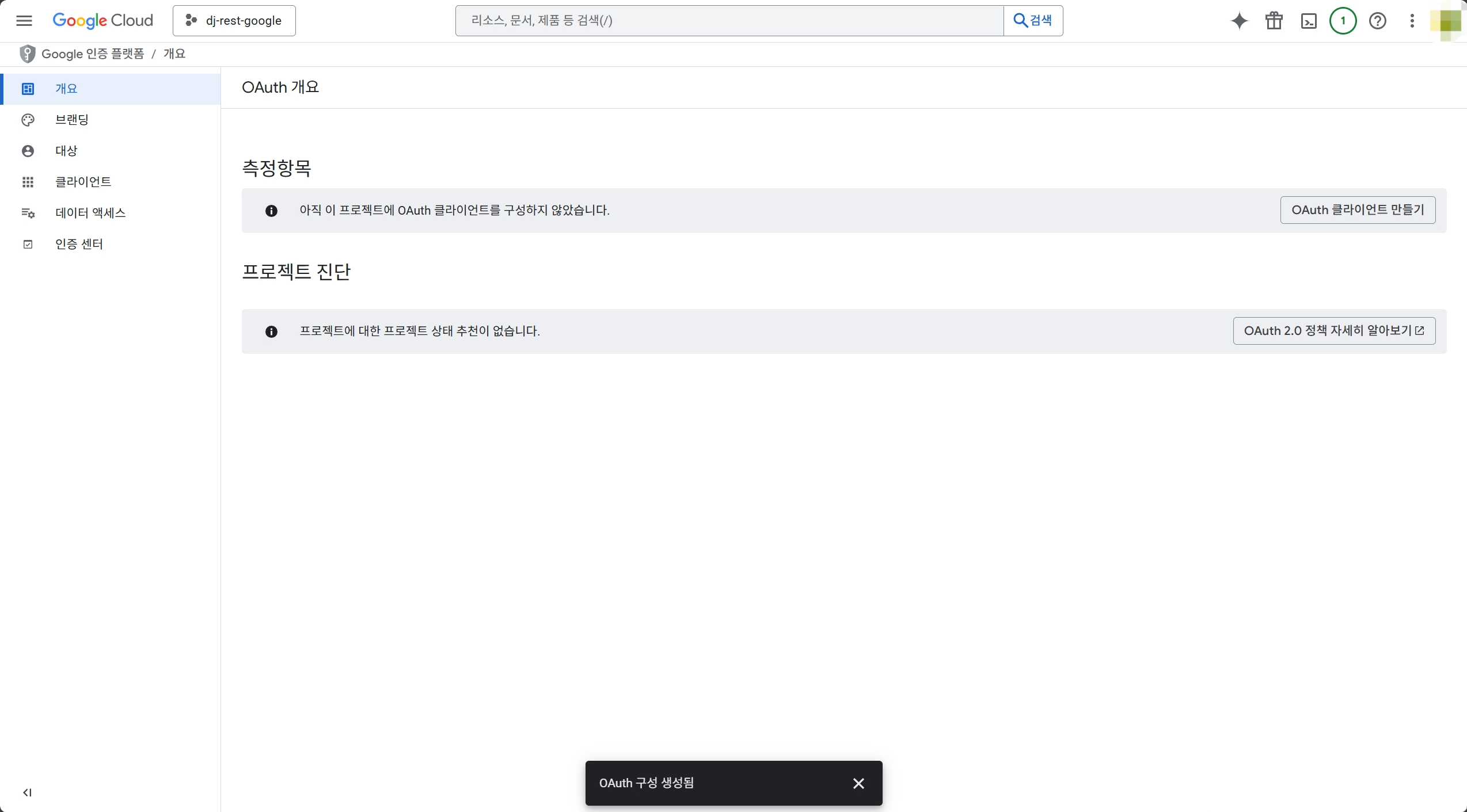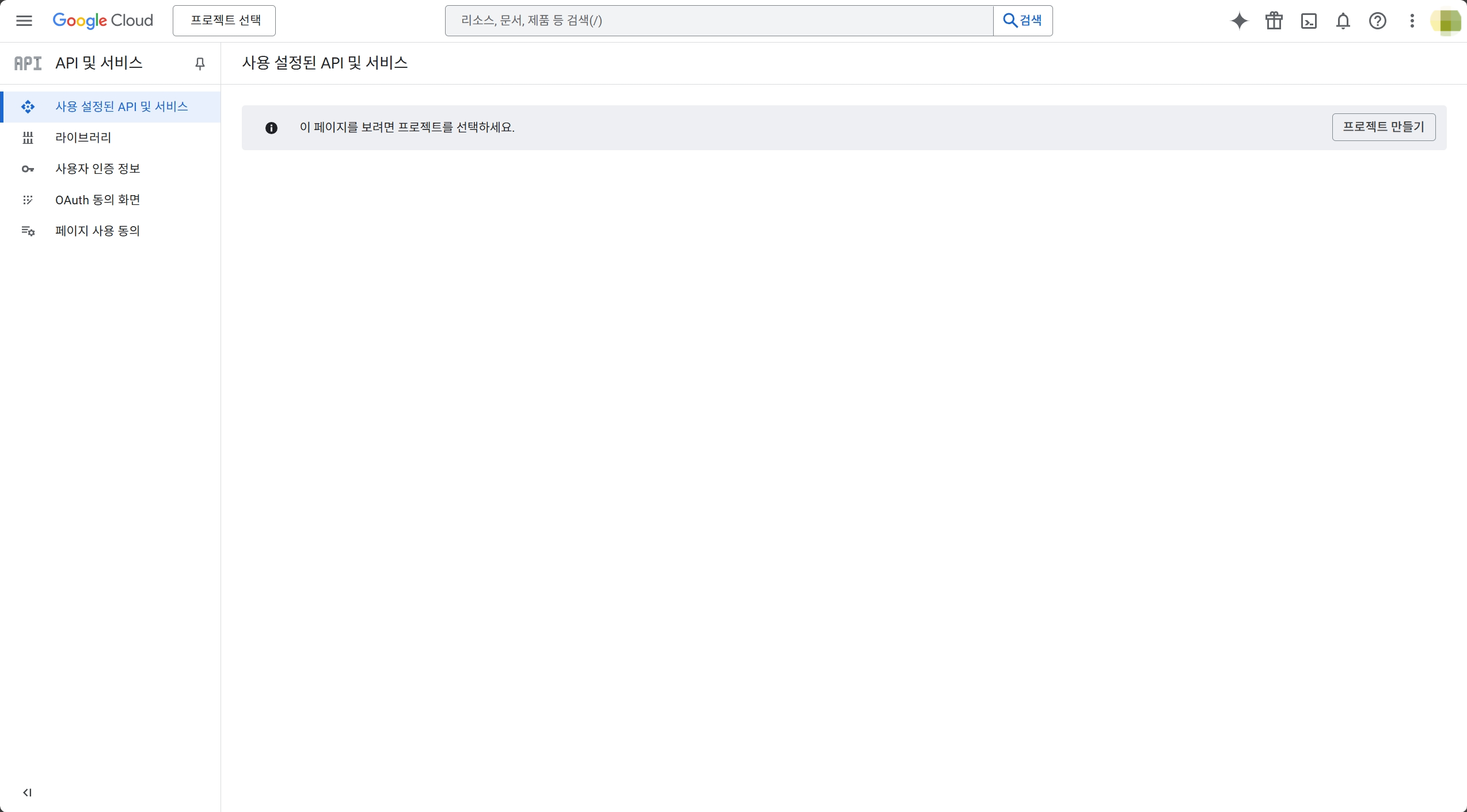 Google Cloud 로고 옆에 아까 만든 프로젝트가 선택되어 있는 것을 확인하고 OAuth 동의 화면을 클릭한다.