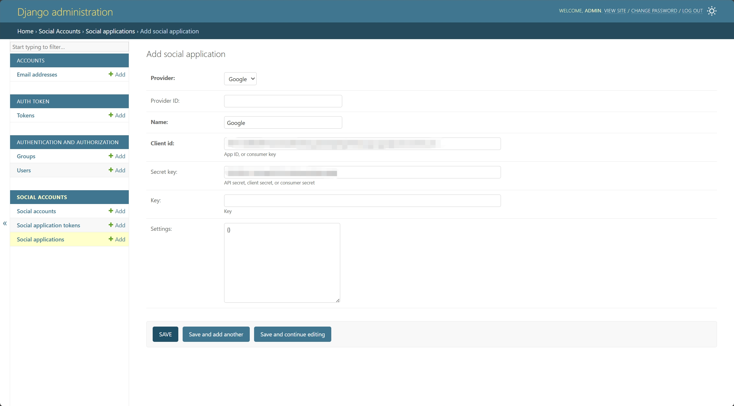 Provider: Google로 선택한다. 지금은 provider가 하나뿐이라 자동으로 Google로 선택되어 있을 것이다.Name: 자유롭게 정한다. 다만, django-allauth의 공식 문서에서는 Google을 추천한다.Client id: 아까 받은 json 파일에서 client_id의 값을 복사 붙여넣기한다.Secret key: 아까 받은 json 파일에서 client_secret의 값을 복사 붙여넣기한다.다 입력했으면 SAVE를 클릭한다.