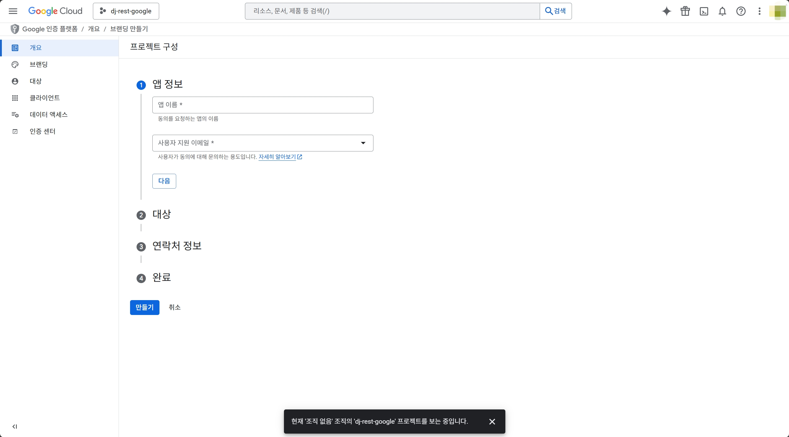 입력하라는 정보를 순서대로 모두 채우고 나서 만들기를 클릭한다.
