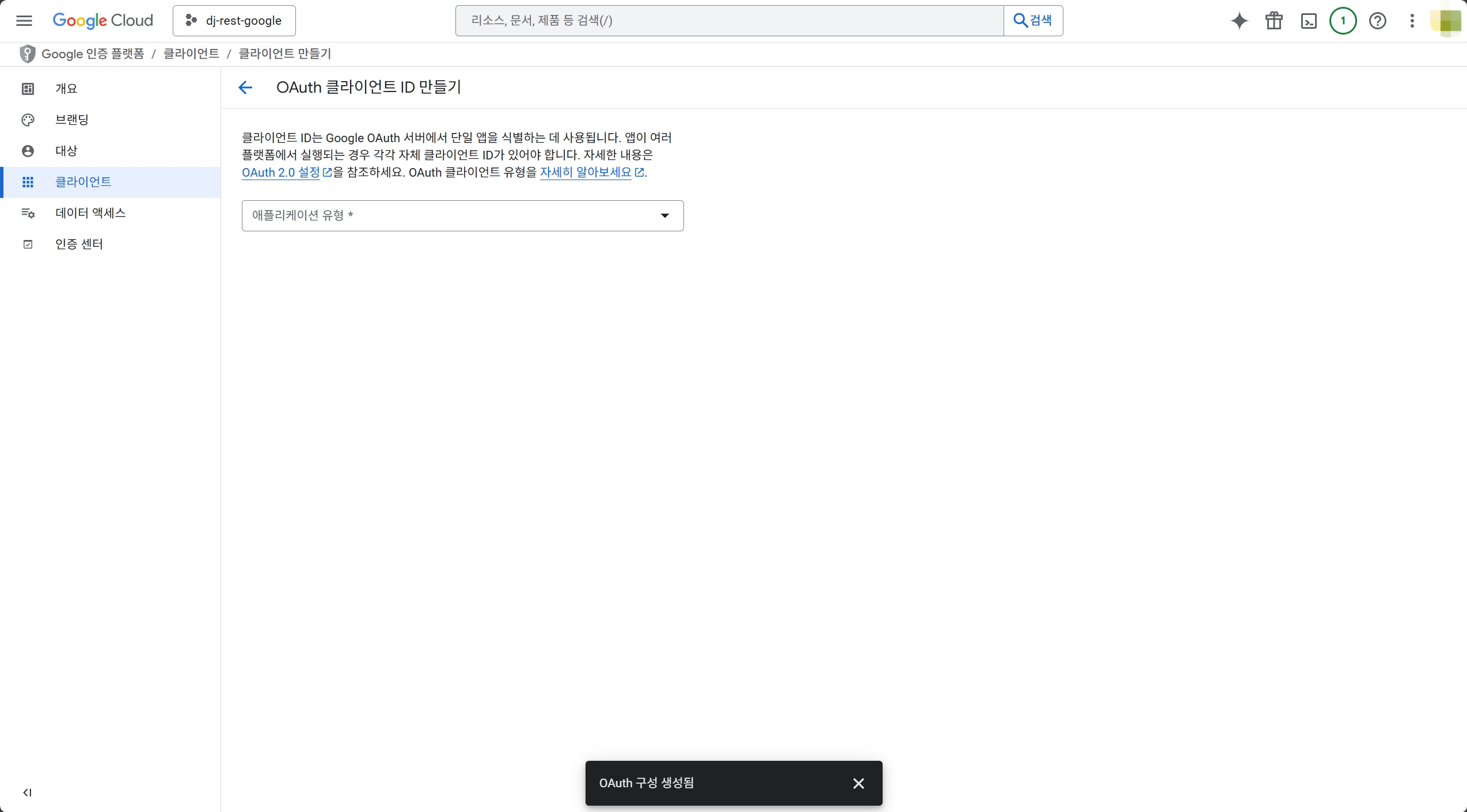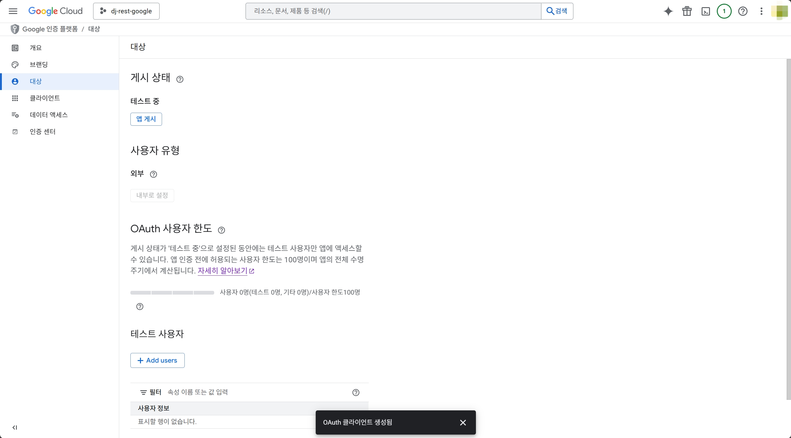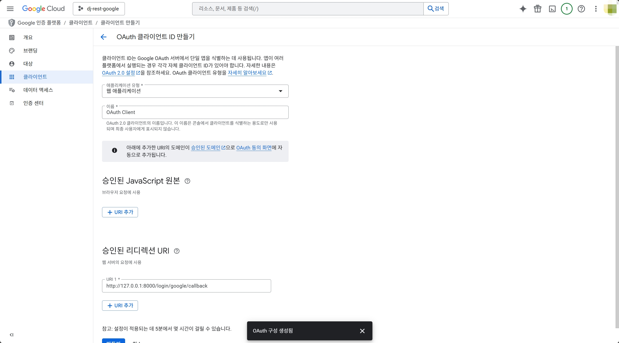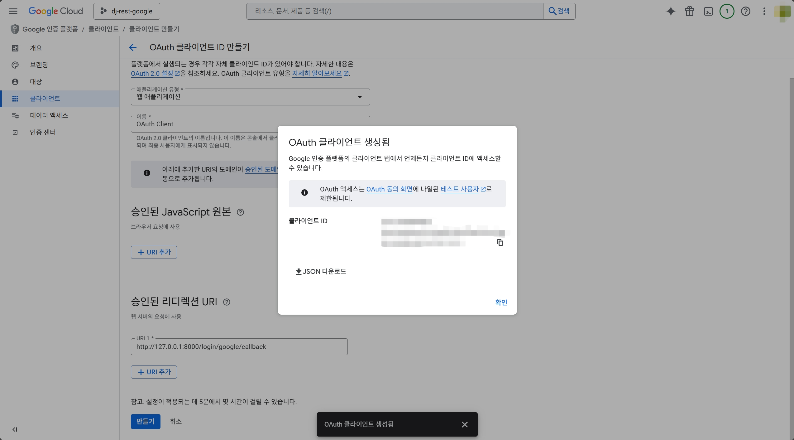 이름은 아무렇게나 정하고, 승인된 리다이렉션 URI에 아까 콜백 뷰를 연결한 URI를 입력한다. 나는 로컬에서 테스트할 것이므로 http://127.0.0.1:8000/login/google/callback이라고 입력했다. 이후 만들기를 클릭한다.