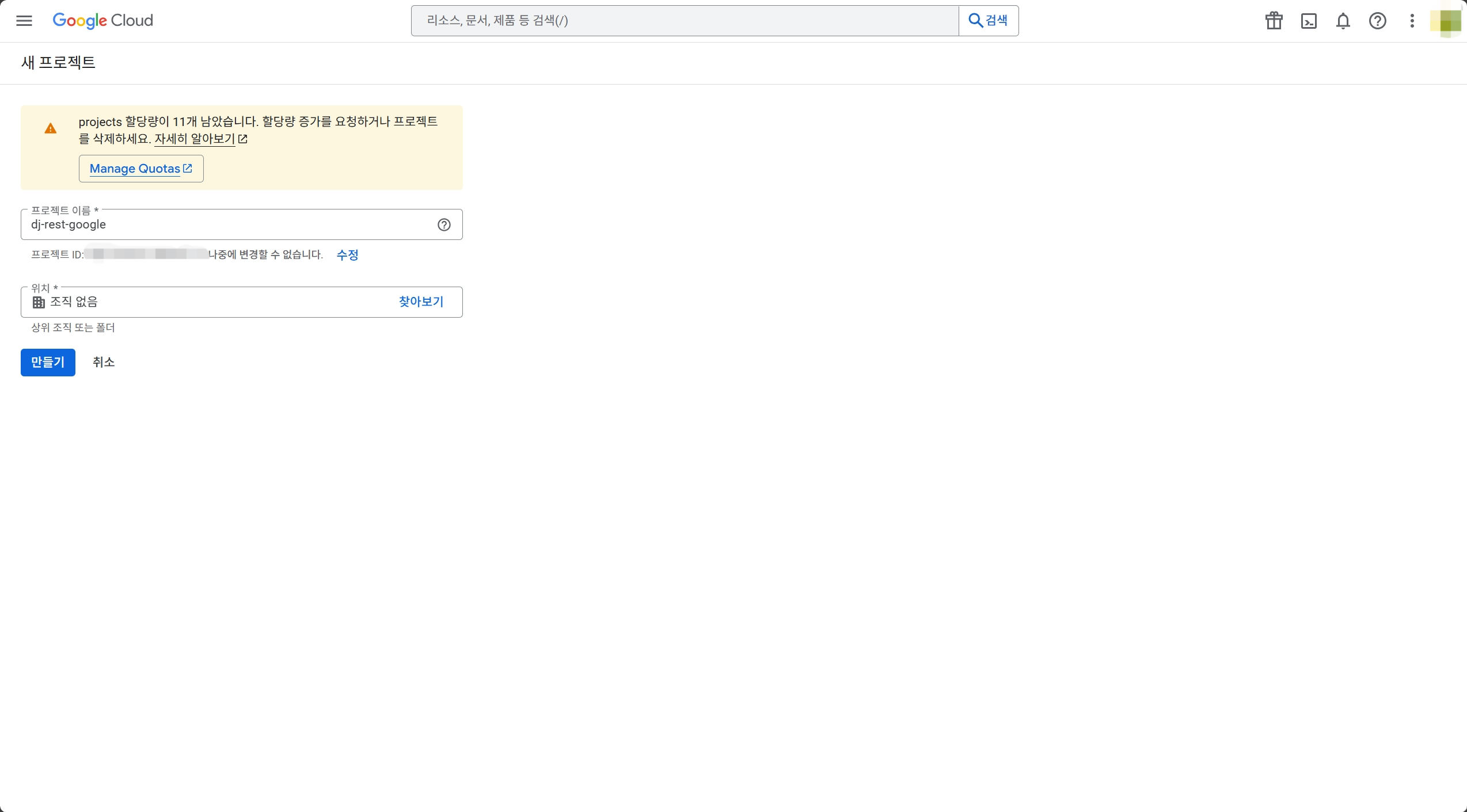 프로젝트 이름은 아무렇게 바꿔주고 만들기를 클릭한다. 나는 dj-rest-google이라고 정했다. 할당량이 11개 남았다고 나오는데, 실습하려고 만들어 본 게 있기 때문에, 남은 할당량은 다르게 나올 수도 있다.