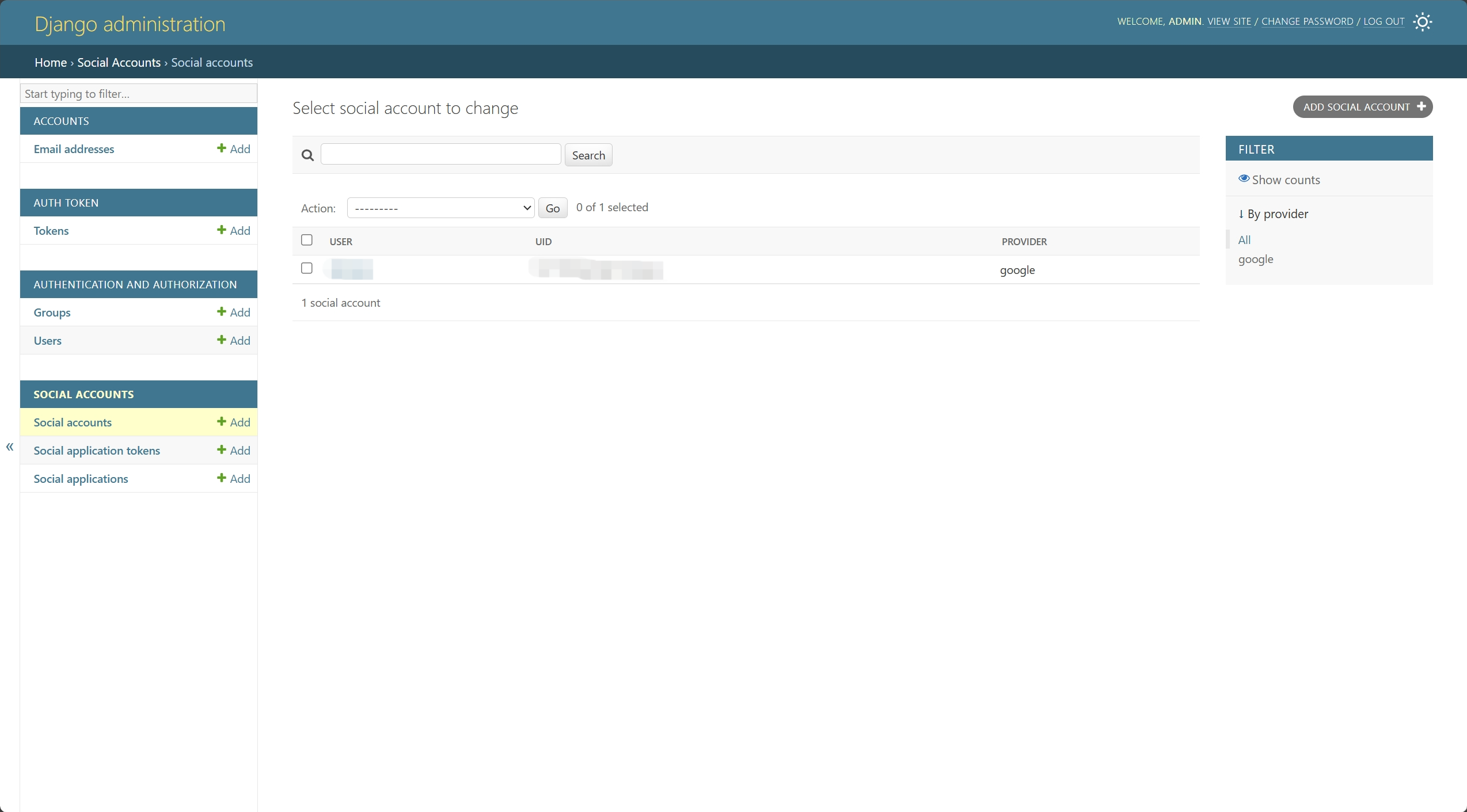 Social accounts를 누르면, 이렇게 자신이 로그인한 계정의 이름과 UID 그리고 google이라는 Provider를 볼 수 있을 것이다.