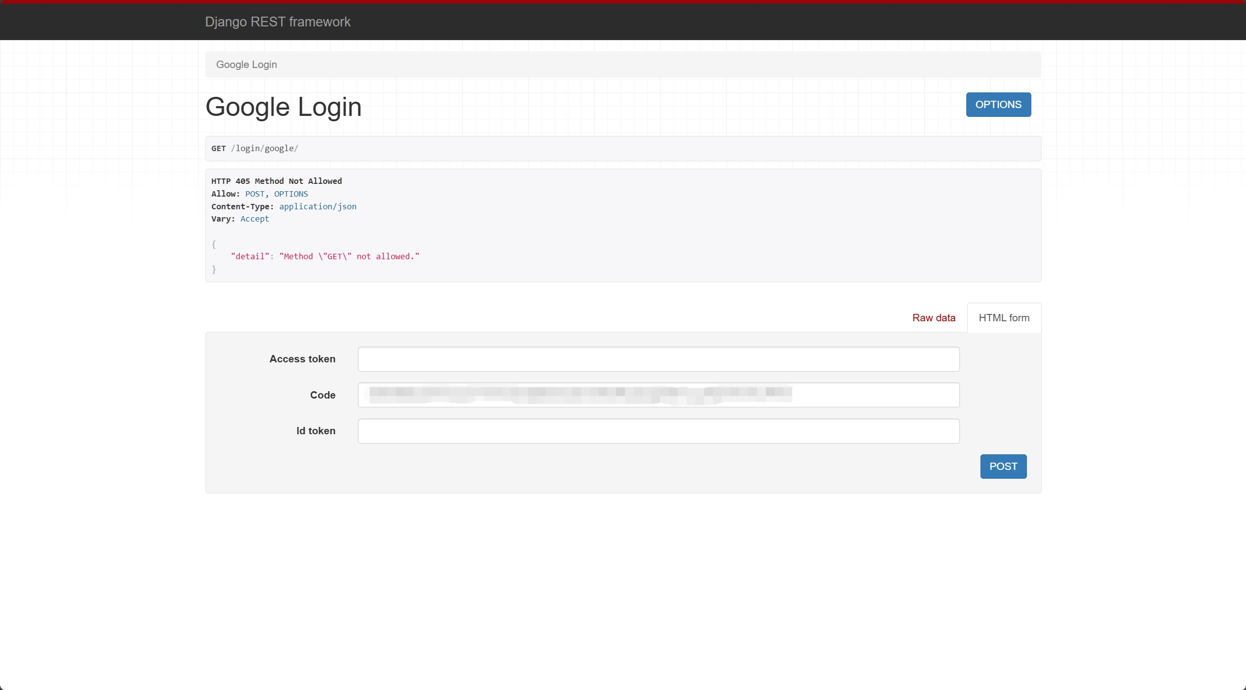 그 후 /login/google/로 이동하여 아까 복사한 코드를 Code에 붙여넣고, POST를 클릭한다.