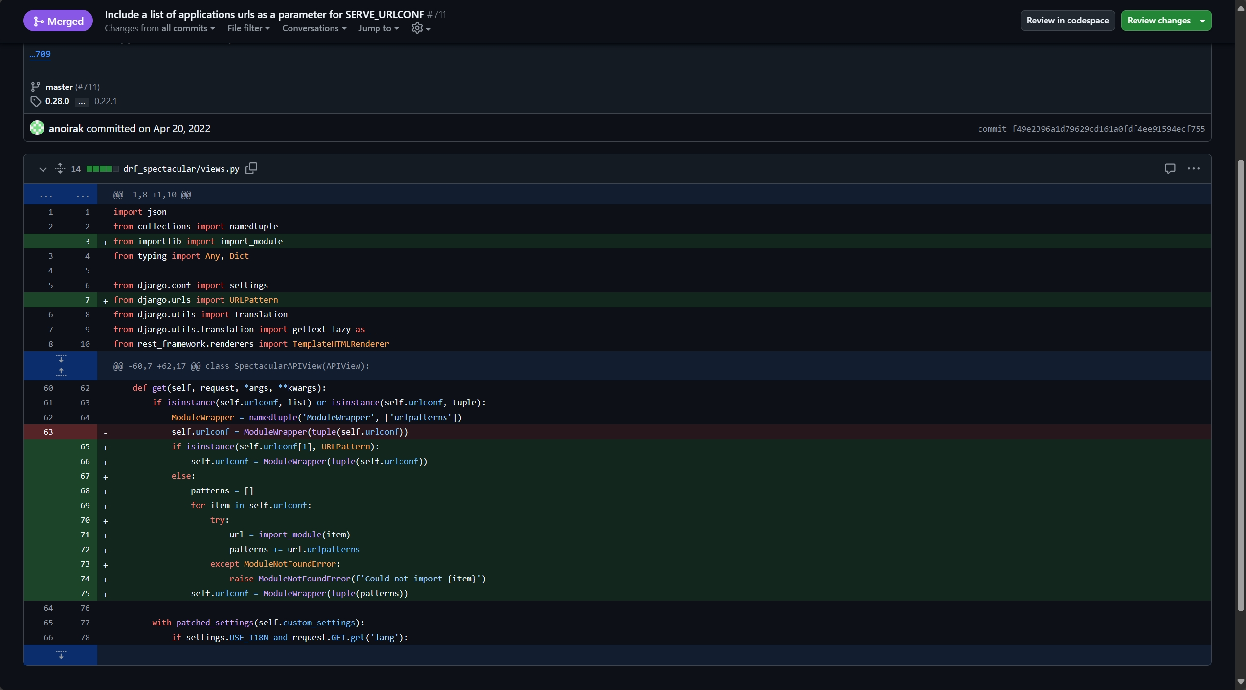 해당 PR의 커밋으로, 위에서 살펴본 코드와 전체적인 로직이 비슷하다. 이 PR이 실제로 받아들여져 Merged 처리가 된 것을 보아, 이때부터 SERVE_URLCONF나 urlconf에 리스트와 튜플을 사용할 수 있게 된 것으로 보인다.