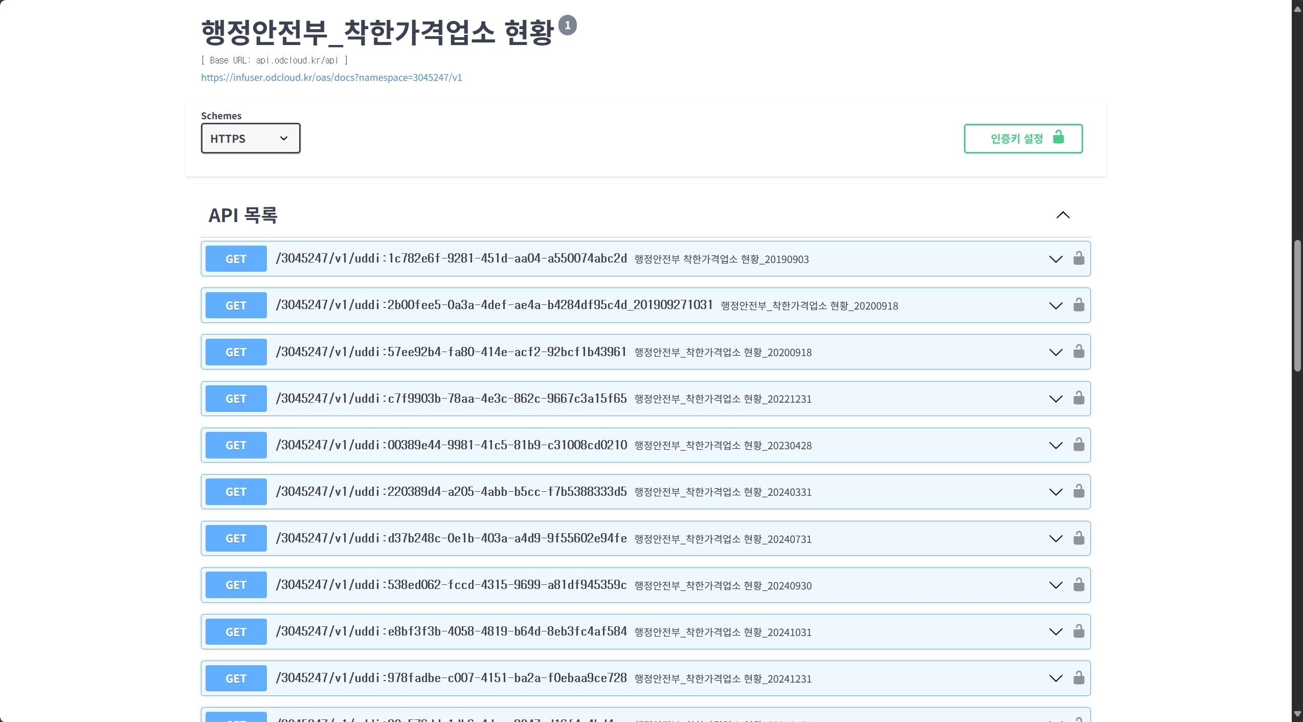 예를 들어, 착한가격업소현황이라는 데이터에서 오픈 API가 제공되고, 데이터를 조회할 수 있는 목록을 제공한다.