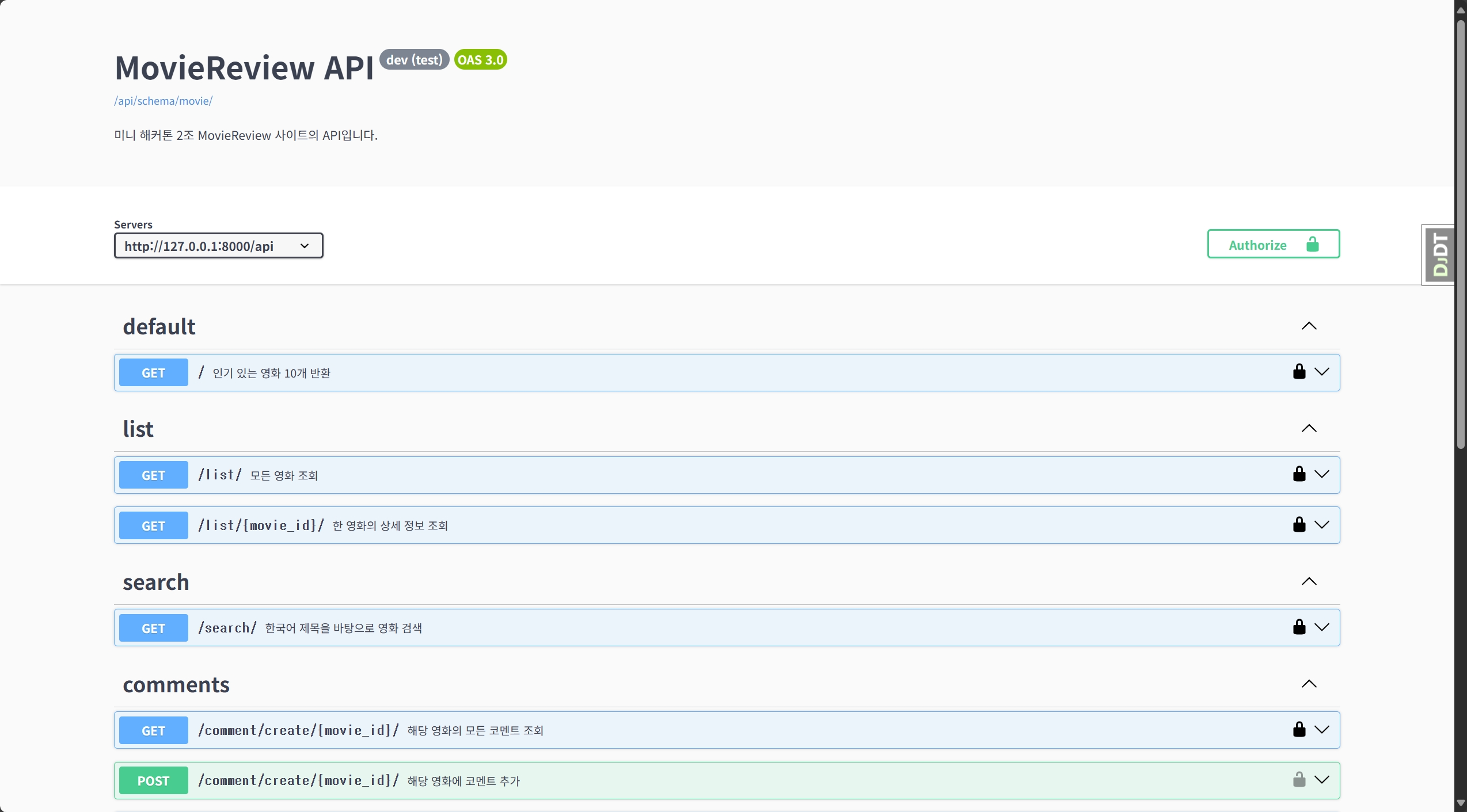 'DESCRIPTION': '미니 해커톤 2조 MovieReview 사이트의 API입니다.',